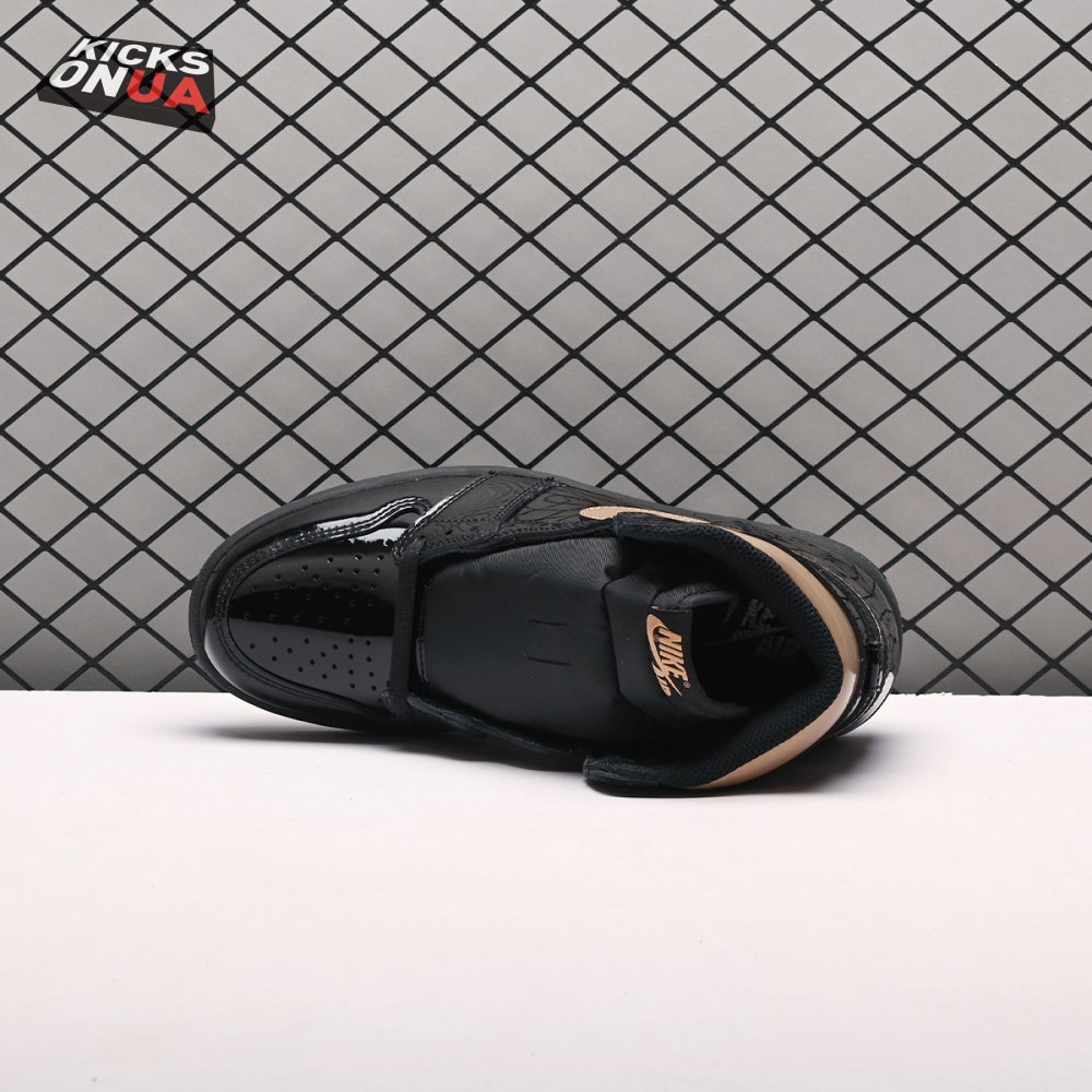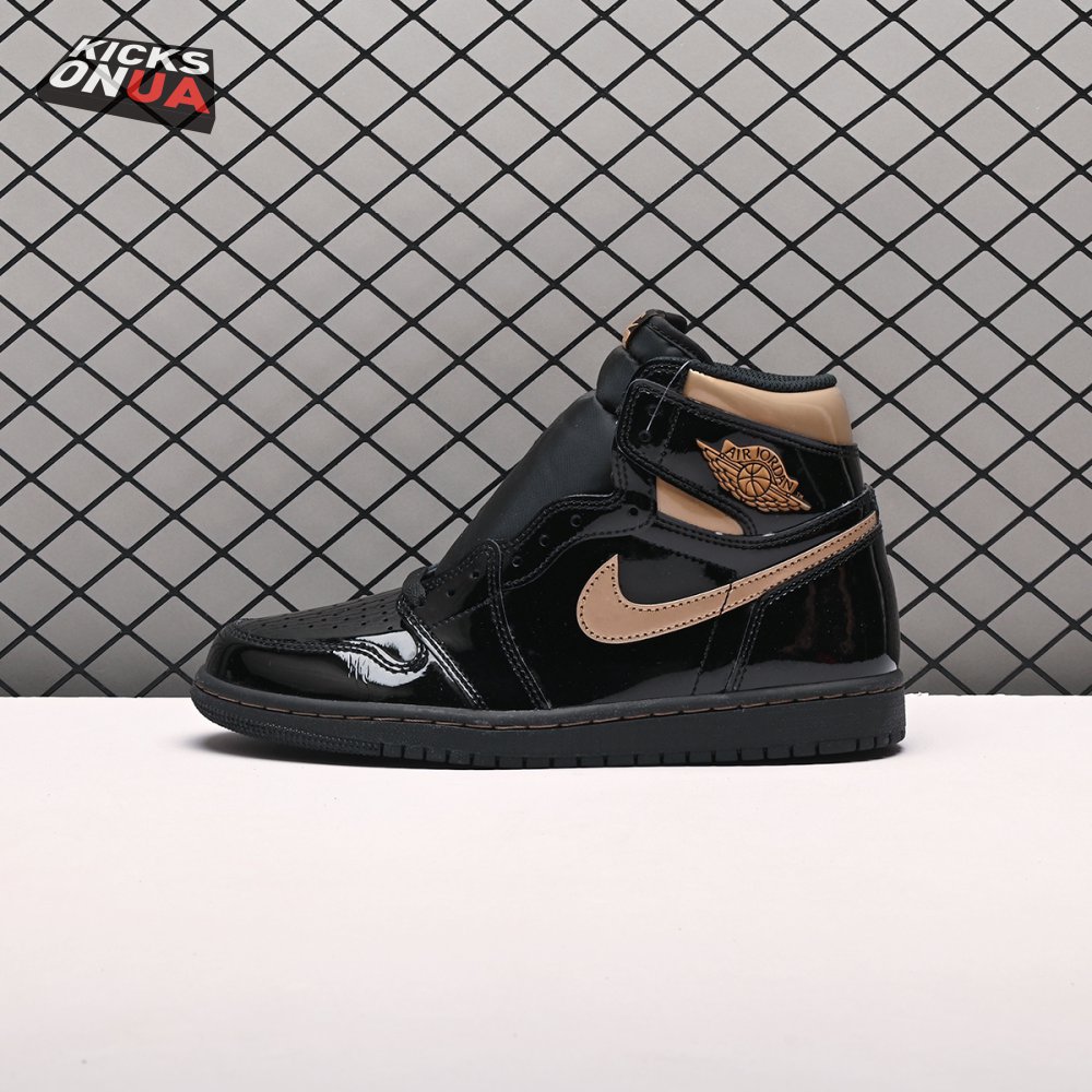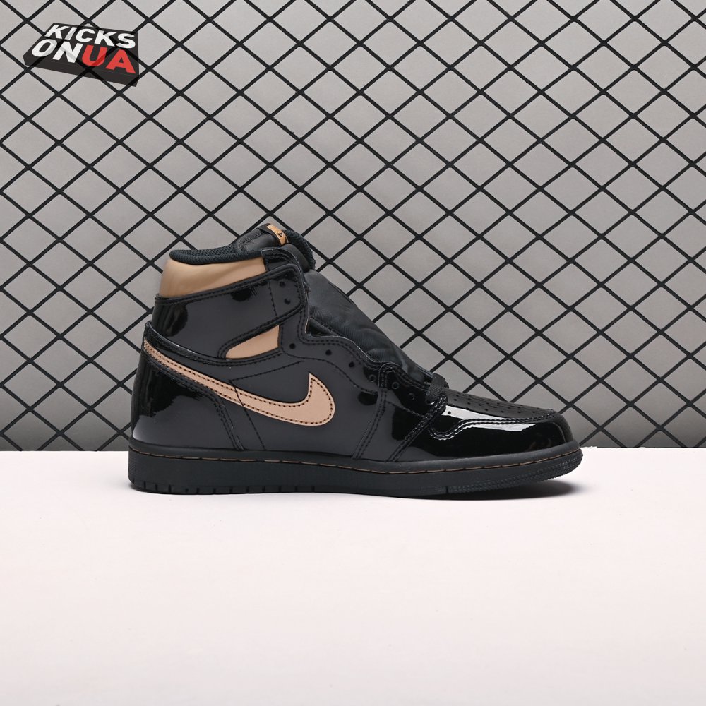 The Air Jordan 1 Retro High OG "Black Metallic Gold" seemingly takes inspiration from an Air Jordan 1 Mid from 2003 that similarly utilized a black patent leather upper with gilded accents. This pair adds OG touches in the form of a printed Wings logo on the lateral collar flap and a woven Nike tag atop the lightly padded nylon tongue. The two-tone palette is repeated on the sneaker"s tooling, featuring gold stitching that circles the black rubber cupsole.