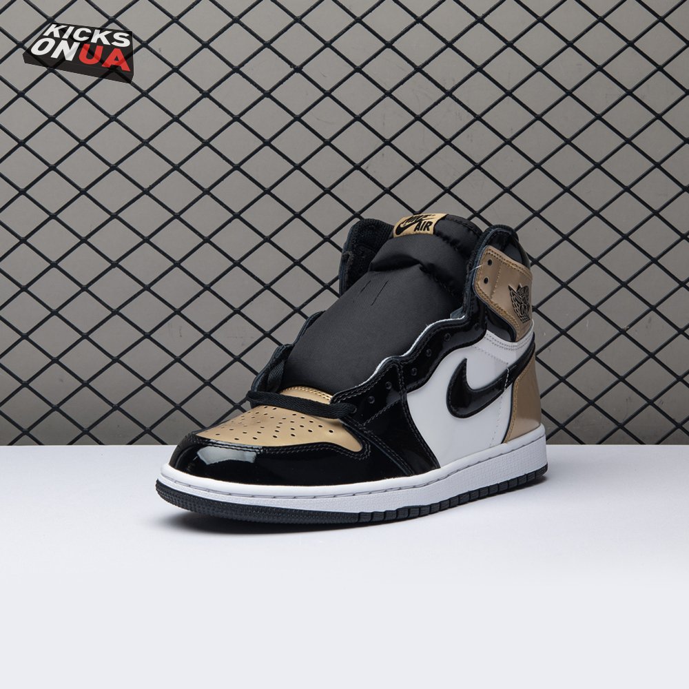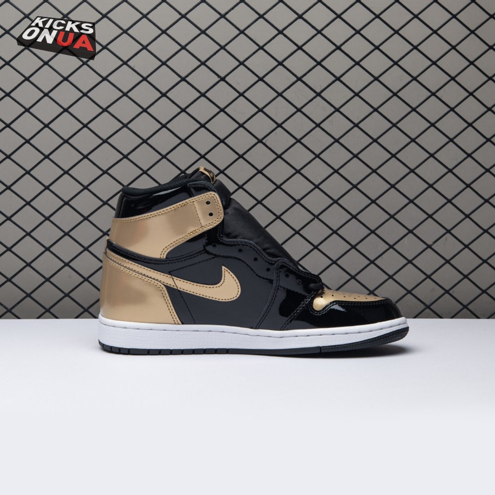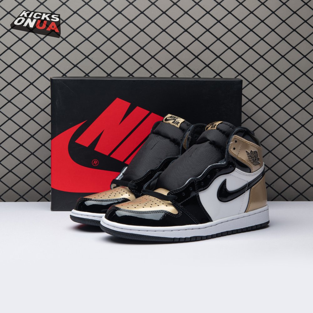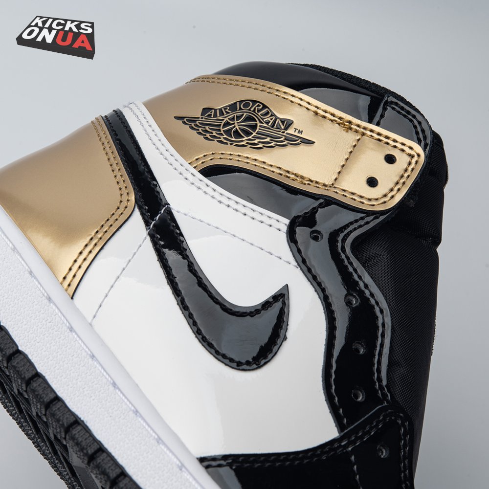 The Air Jordan 1 Retro High OG NRG 'Gold Toe' features a black patent leather upper with distinctive metallic gold accents on the perforated toe box, tongue branding, and the heel panel. The high top also boasts a white side panel which extends from the midfoot to the heel, and a white rubber midsole. Other details include suede accents on the lacing structure, large Swoosh branding, and a tonal black outsole.