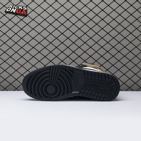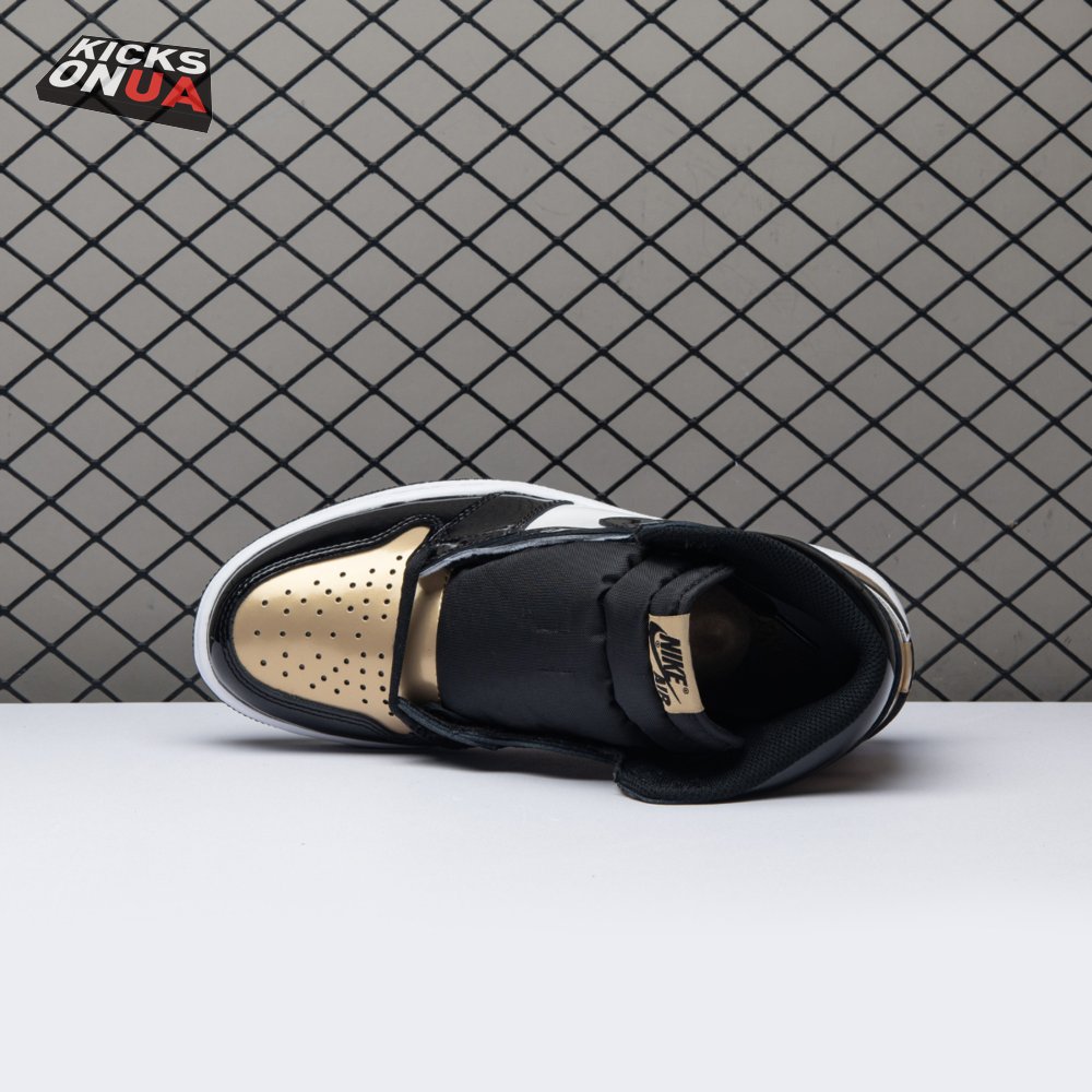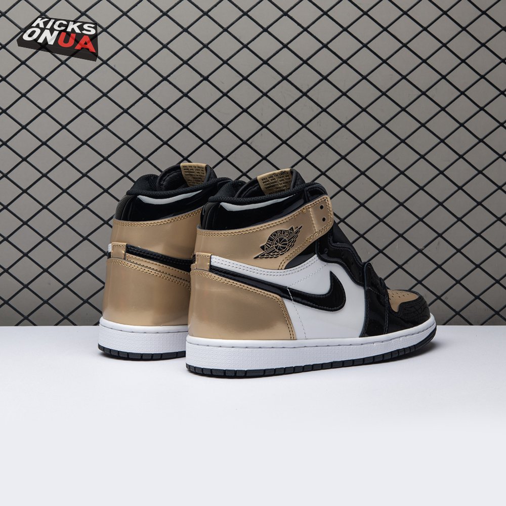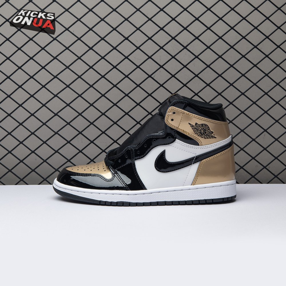 The Air Jordan 1 Retro High OG NRG 'Gold Toe' features a black patent leather upper with distinctive metallic gold accents on the perforated toe box, tongue branding, and the heel panel. The high top also boasts a white side panel which extends from the midfoot to the heel, and a white rubber midsole. Other details include suede accents on the lacing structure, large Swoosh branding, and a tonal black outsole.
