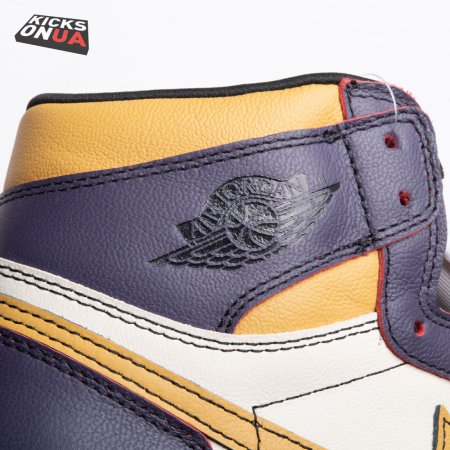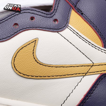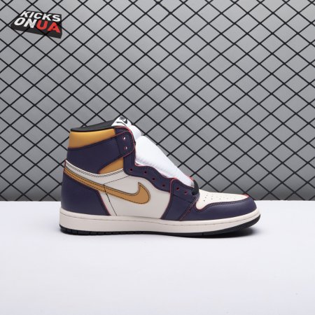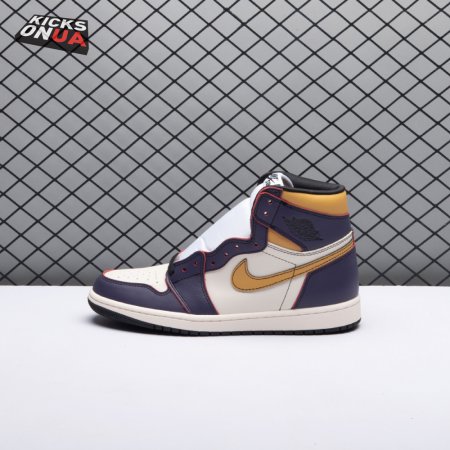 The iconic Air Jordan 1 silhouette was a skate staple in the 80s due to its full-leather construction and tough midsole/outsole combination. Working together again with Nike SB, the Air Jordan 1 returns in this 'Lakers vs. Bulls' edition that launched in May 2019. This colorway pays homage to the legendary matchup through a Court Purple and University Gold scheme on the leather upper that wears away to reveal red and black alternate hues. Lateral Swooshes, a Wings logo and nylon tongue fall in line with the original look.