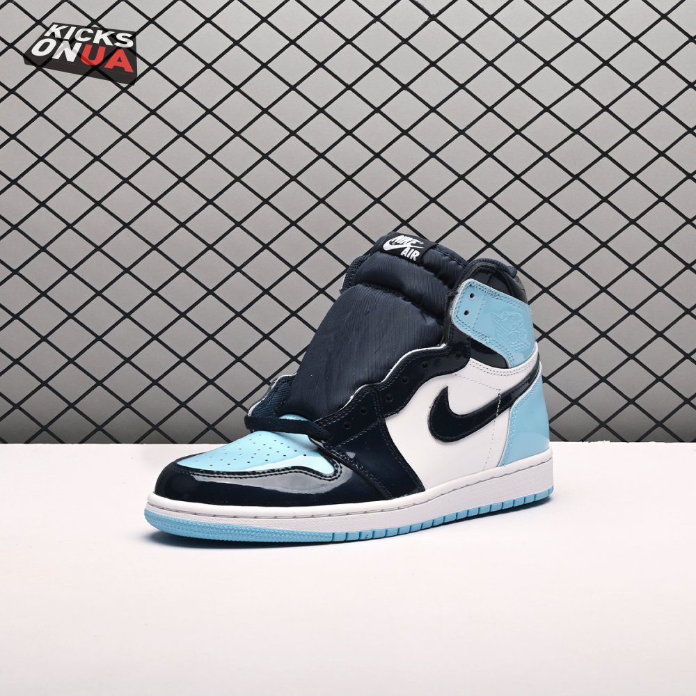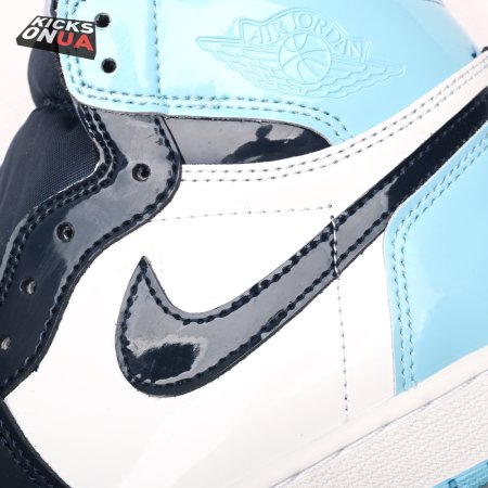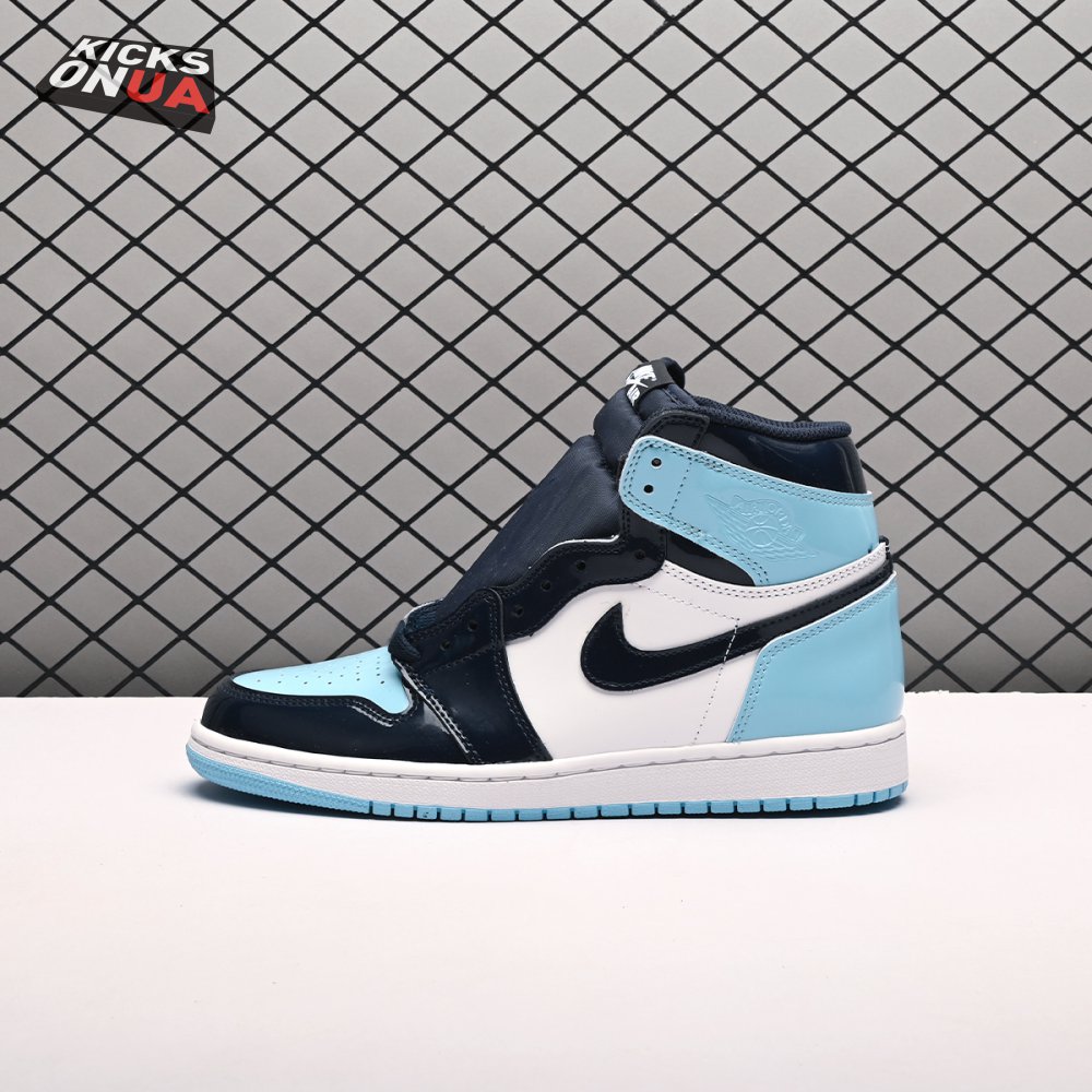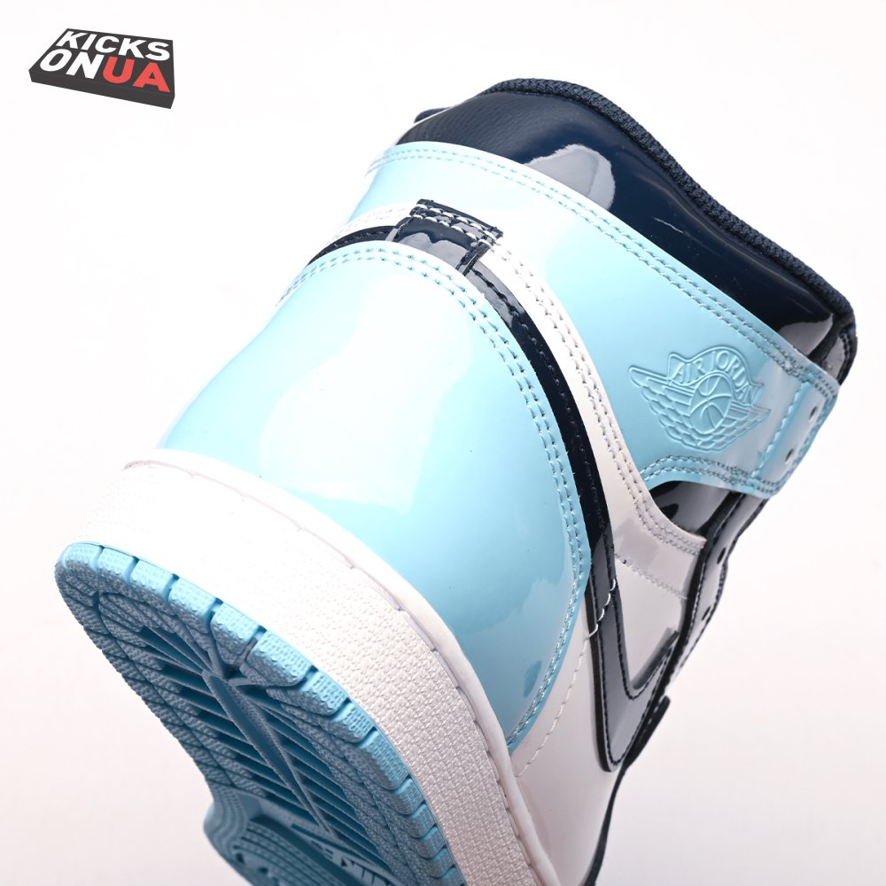 The Women's Air Jordan 1 Retro High OG 'Blue Chill' features a patent leather upper in Blue Chill and white with Obsidian overlays throughout. Released February 2019, the colors are inspired from Michael Jordan's roots in North Carolina as well as the NBA All-Star host city Charlotte.