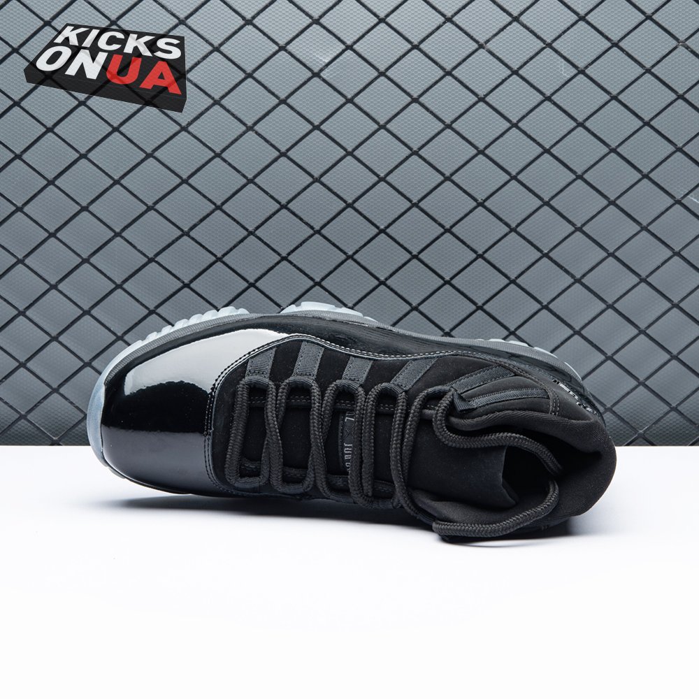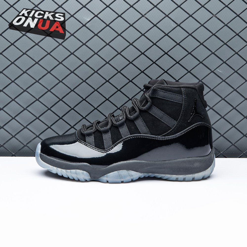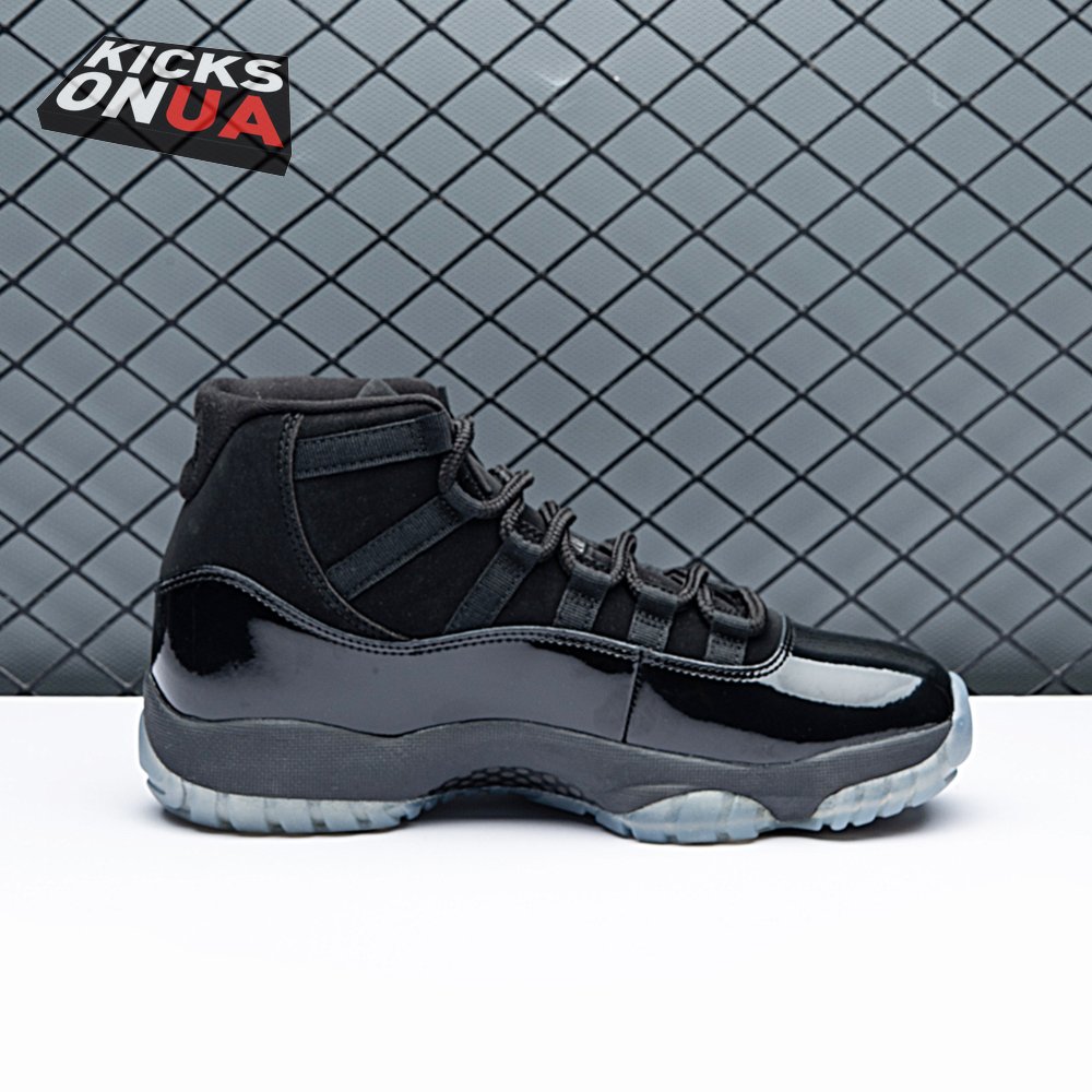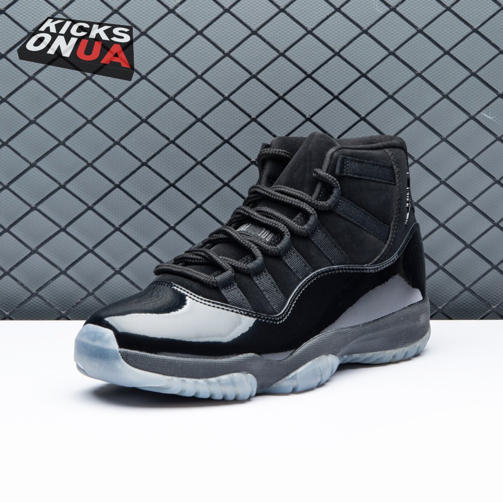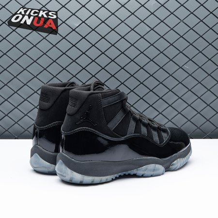 First teased in 2011 as a sample from the Air Jordan Blackout Collection, the Air Jordan 11 Retro 'Cap and Gown' was finally made available to the public in 2018. The name refers its formal look, designed to be worn for occasions such as graduation ceremonies"its laces are even inspired by graduation cords. The all-black model features a patent leather and premium nubuck upper atop an icy blue outsole.