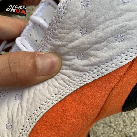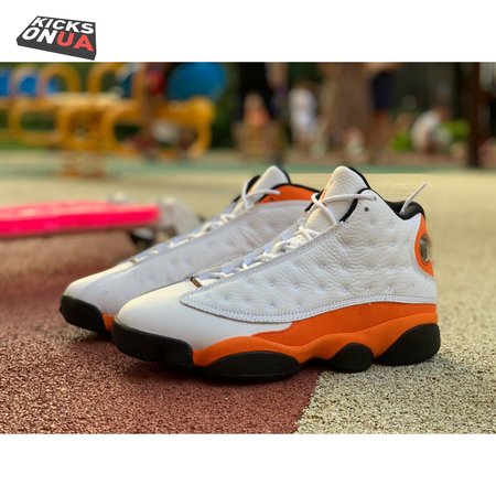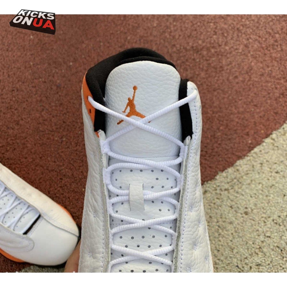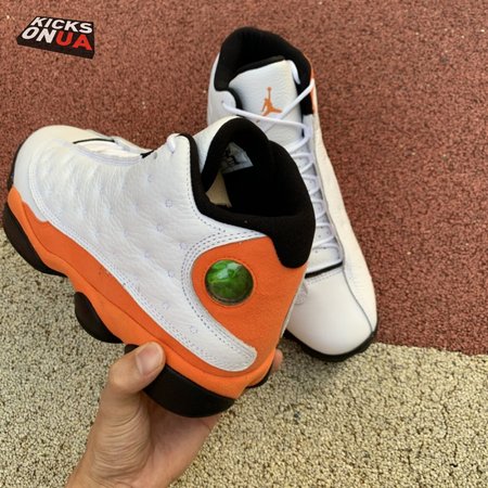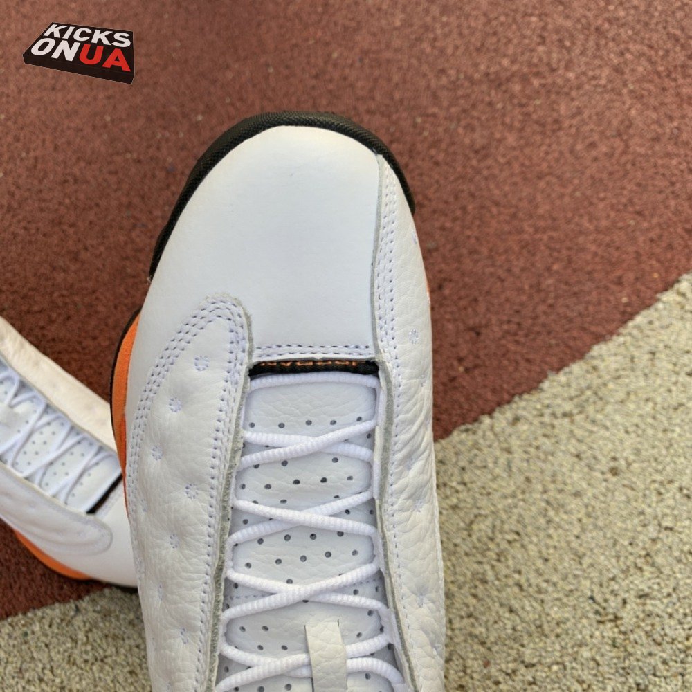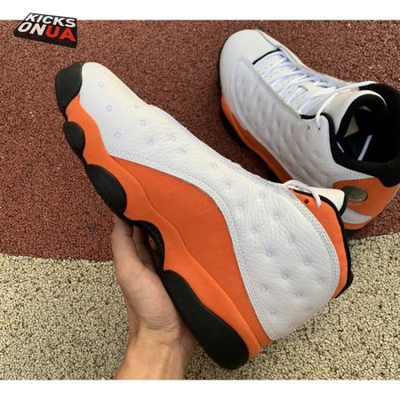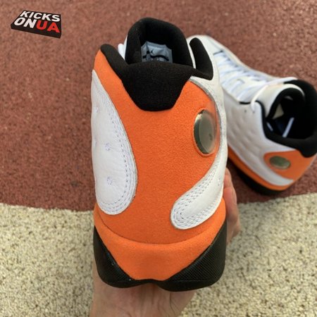 The Air Jordan 13 Retro "Starfish" features a familiar color palette that recalls the "Shattered Backboard" editions of the Air Jordan 1. The upper combines a white tumbled leather base with orange suede paneling and signature dimpled overlays in more white leather. Traditional branding elements include an embroidered Jumpman atop the tongue and the 13's holographic eye on the lateral ankle. A contrasting black finish is applied to the panther-paw outsole.