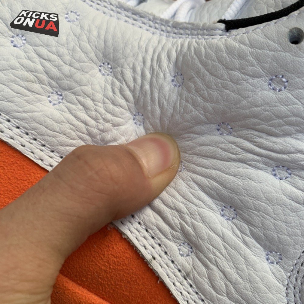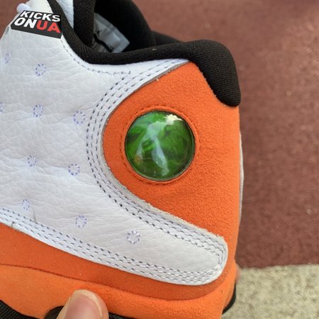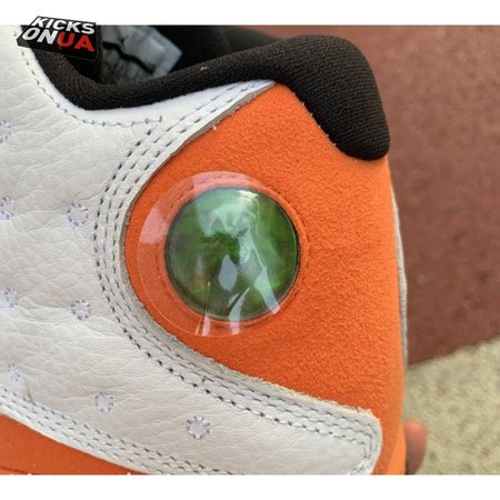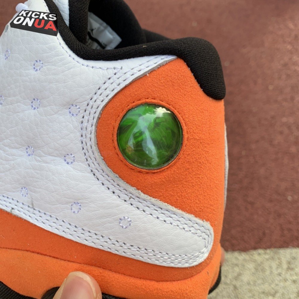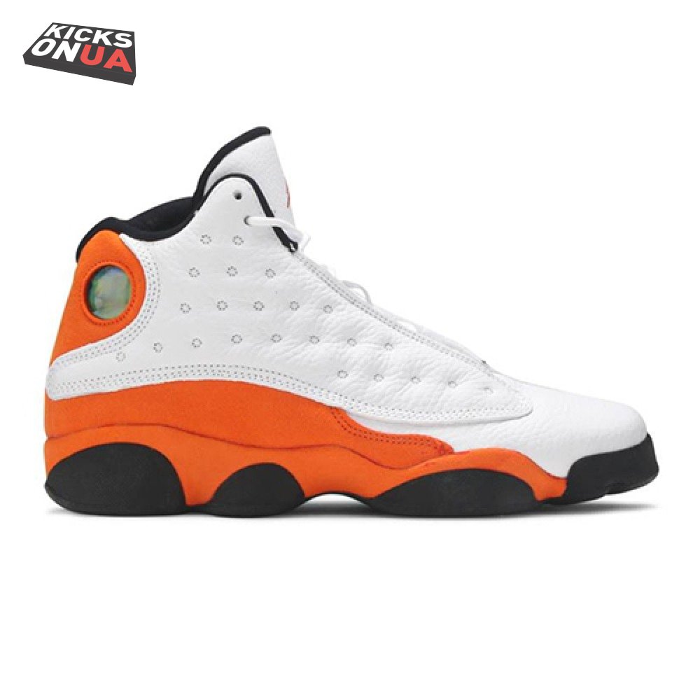 The Air Jordan 13 Retro "Starfish" features a familiar color palette that recalls the "Shattered Backboard" editions of the Air Jordan 1. The upper combines a white tumbled leather base with orange suede paneling and signature dimpled overlays in more white leather. Traditional branding elements include an embroidered Jumpman atop the tongue and the 13's holographic eye on the lateral ankle. A contrasting black finish is applied to the panther-paw outsole.