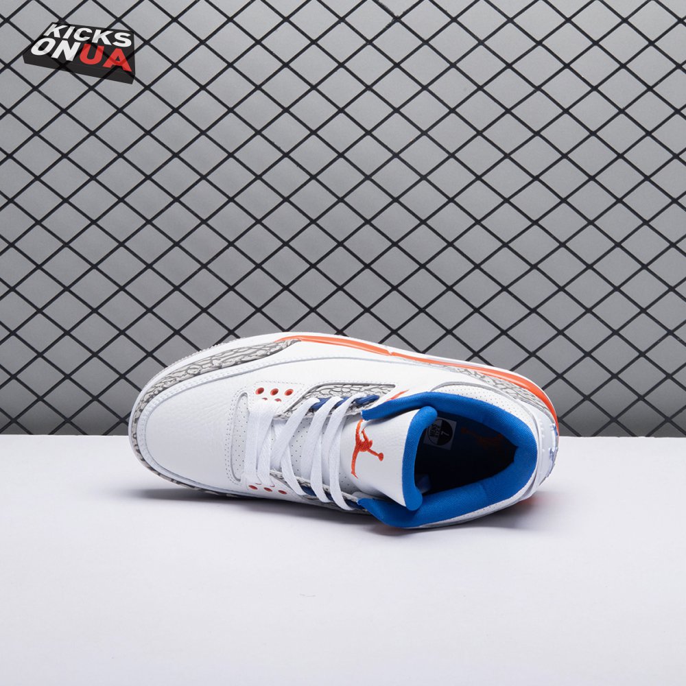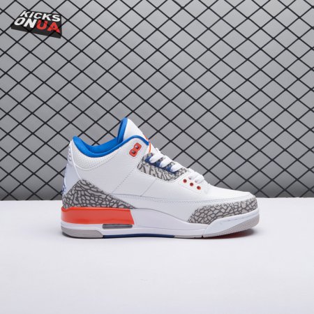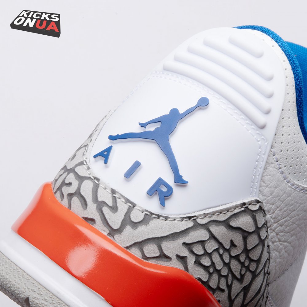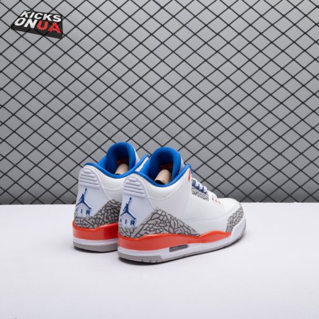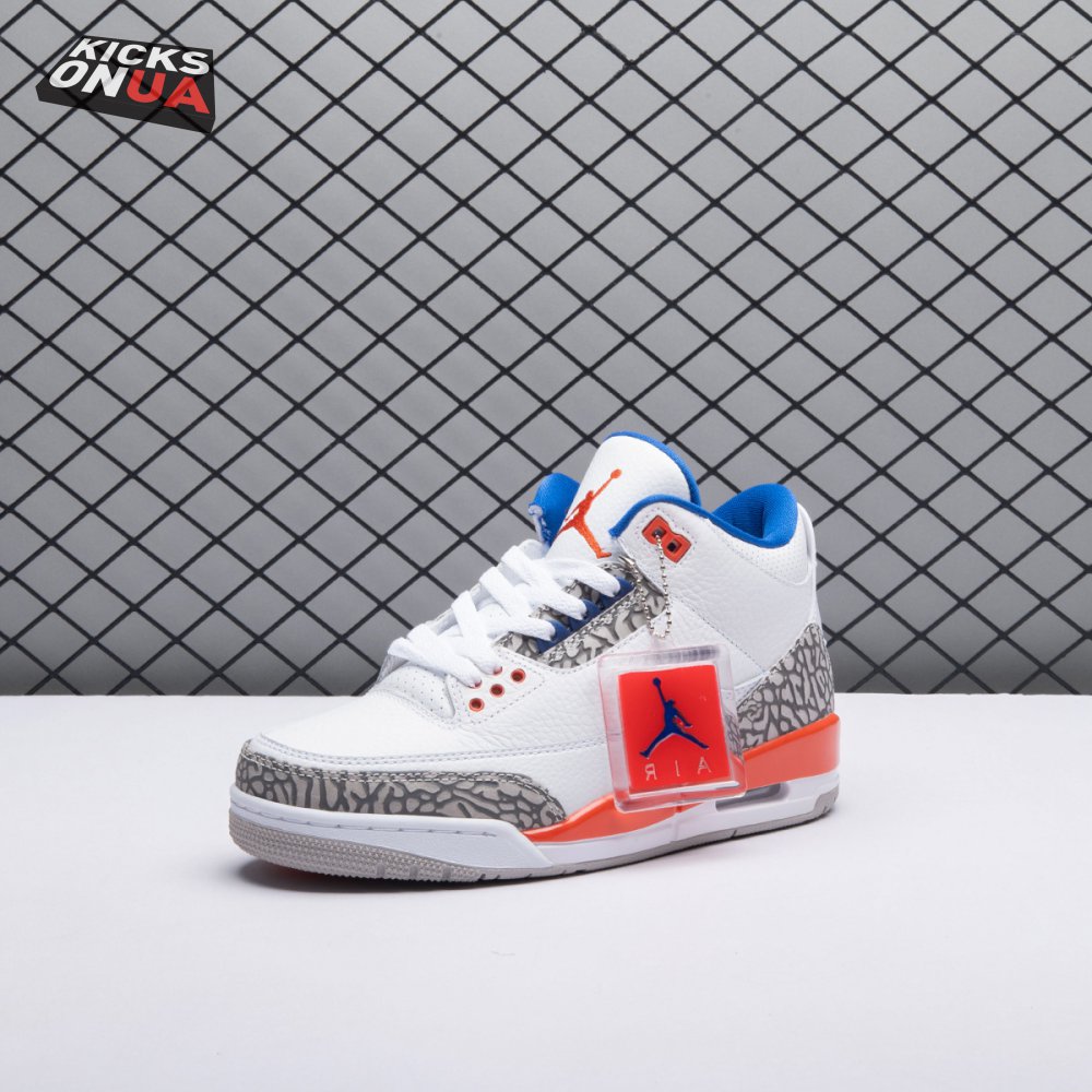 The Air Jordan 3 Retro 'Knicks Rivals' boasts a colorway inspired by a team Michael Jordan and the Chicago Bulls had to hurdle for Eastern Conference dominance, the New York Knicks. The AJ3 was the first of numerous Air Jordans designed by Tinker Hatfield and the debut of the Jumpman logo on the tongue. This 'Knicks Rivals' retro, released in September 2019, stays true to the original silhouette with a white tumbled leather upper, elephant print on the toe cap and heel, Old Royal and University Orange accents, and a visible Nike Air unit.