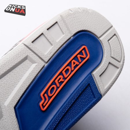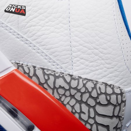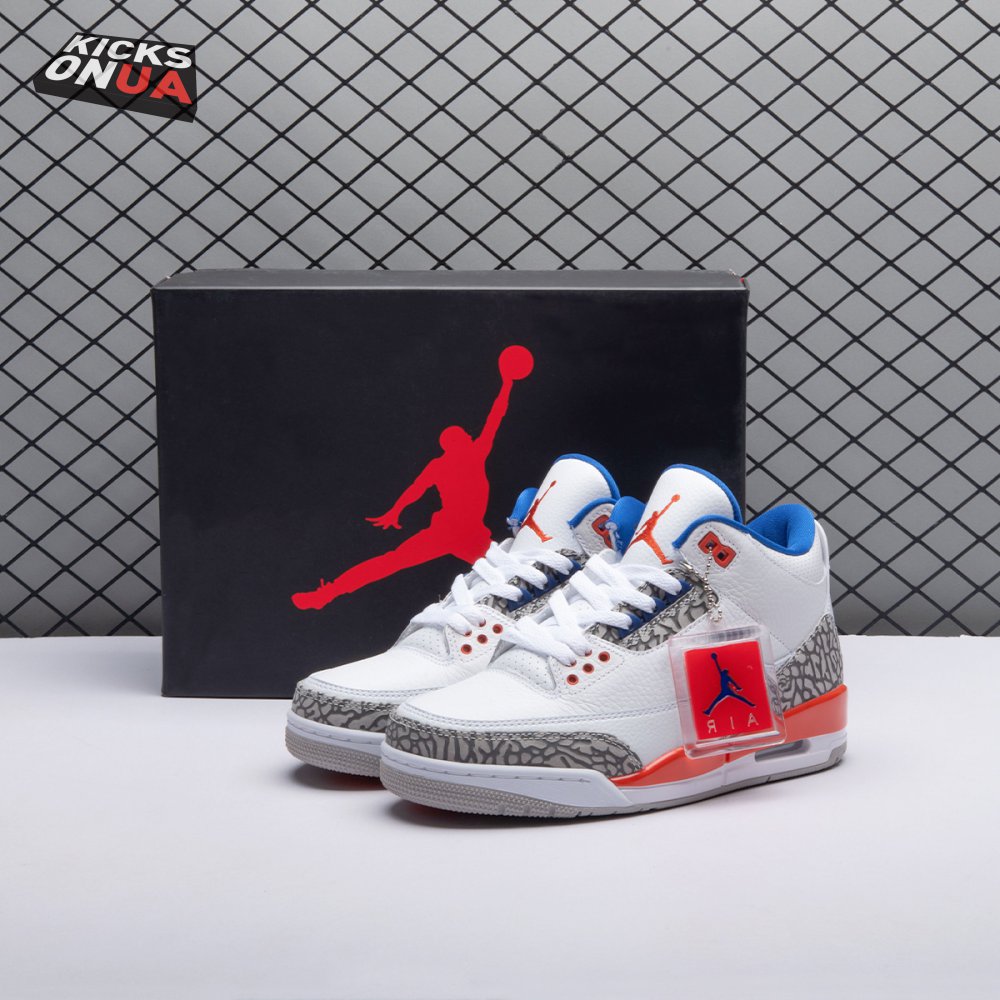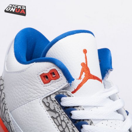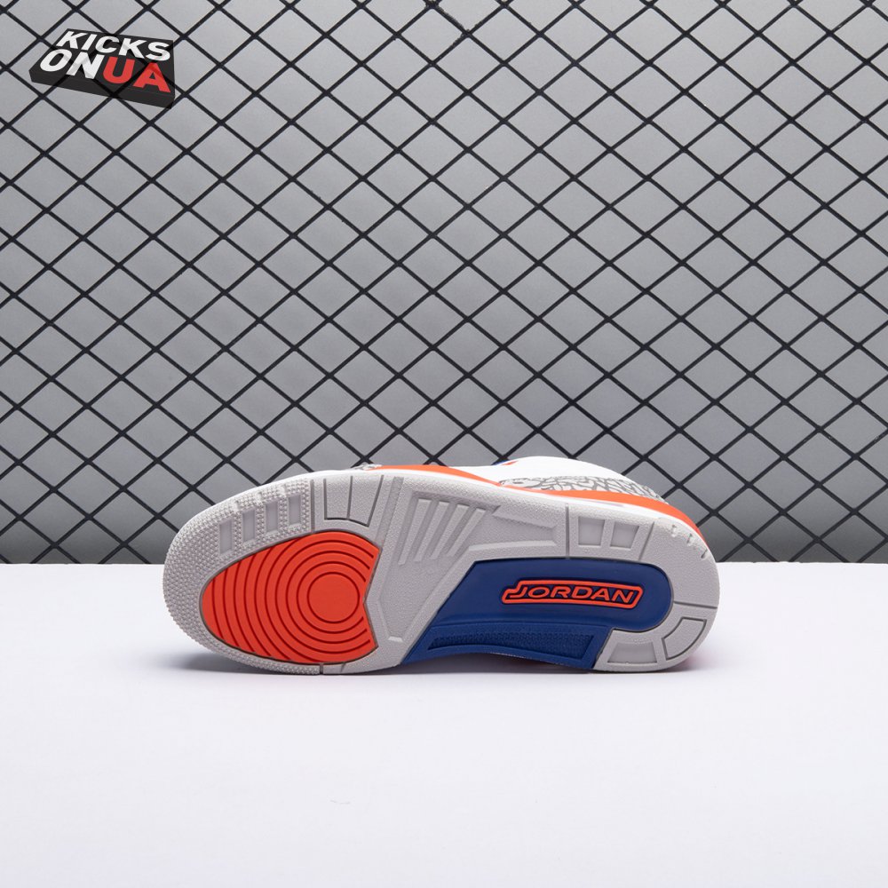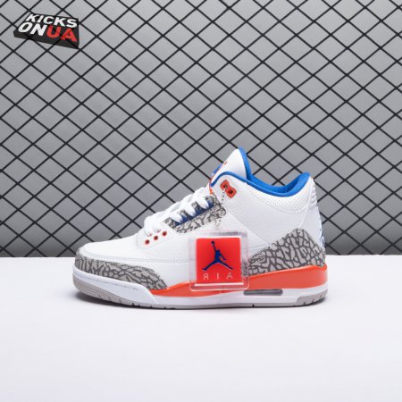 The Air Jordan 3 Retro 'Knicks Rivals' boasts a colorway inspired by a team Michael Jordan and the Chicago Bulls had to hurdle for Eastern Conference dominance, the New York Knicks. The AJ3 was the first of numerous Air Jordans designed by Tinker Hatfield and the debut of the Jumpman logo on the tongue. This 'Knicks Rivals' retro, released in September 2019, stays true to the original silhouette with a white tumbled leather upper, elephant print on the toe cap and heel, Old Royal and University Orange accents, and a visible Nike Air unit.
