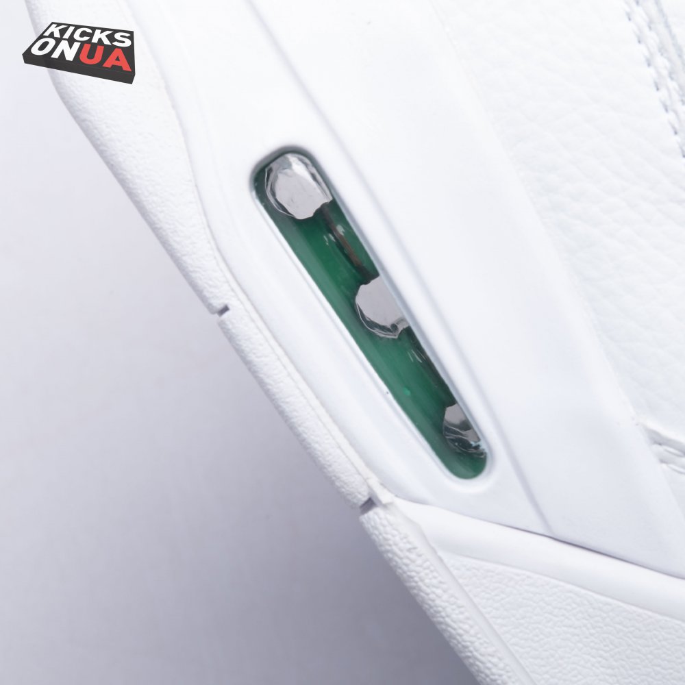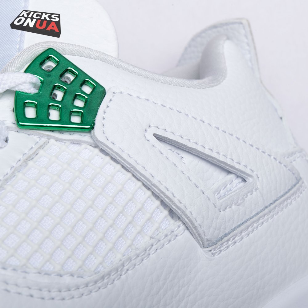 The Air Jordan 4 Retro "Green Metallic" is drawn from a four-piece Metallic Pack that features a single accent color. Here, the metallic green hue is limited to the sneaker"s molded eyelets, interior tongue, and the Jumpman logos that adorn the heel and woven tongue tag. Those elements stand out against a pristine all-white leather build, appointed with standard Air Jordan 4 details that include quarter-panel netting, a visible Air sole unit and an extended pull tab at the heel.