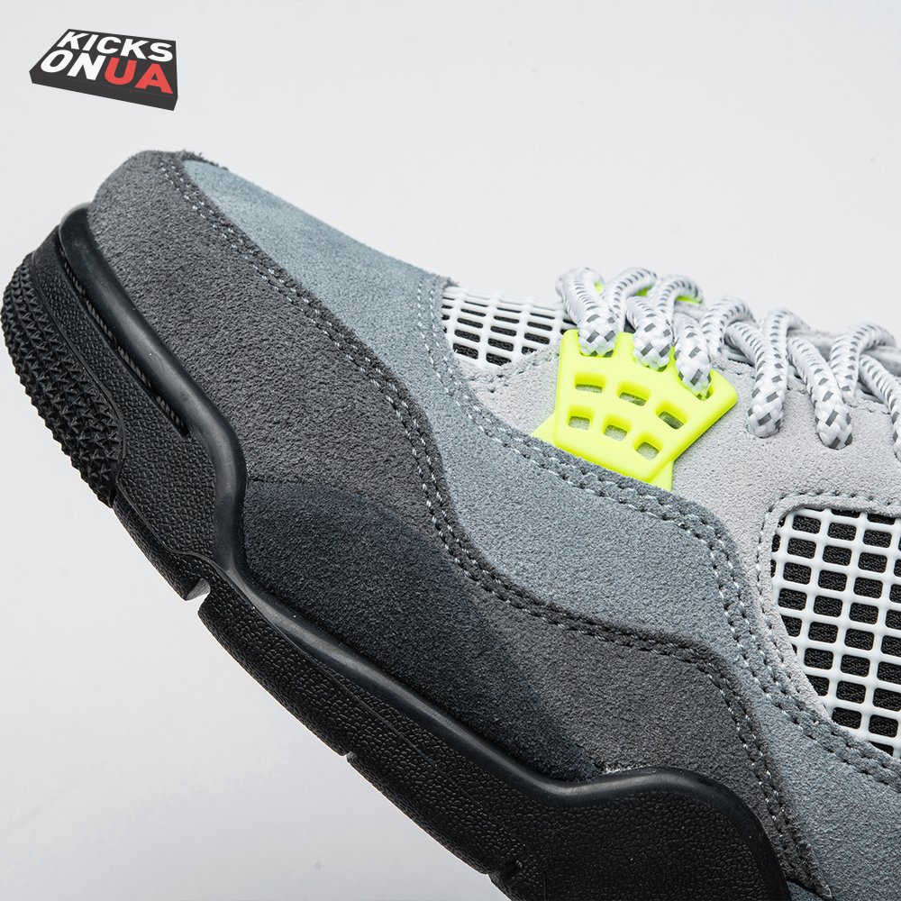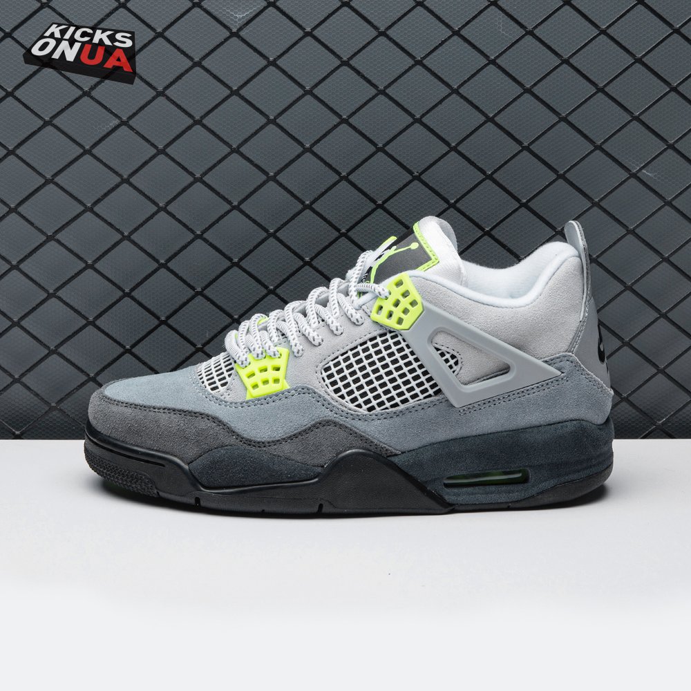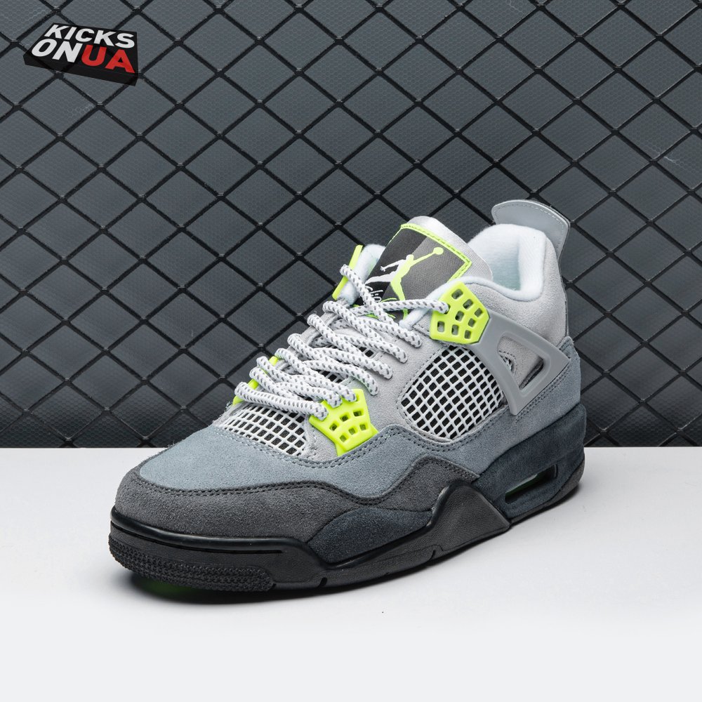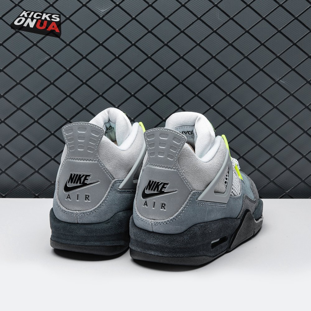The Air Jordan 4 Retro SE 'Neon 95' draws inspiration from the iconic OG colorway of the Air Max 95, featuring varying shades of grey on the suede upper. Vibrant pops of neon yellow appear on the eyelets, quarter panel netting and the Nike Air logo that adorns the molded heel panel. The mid-top rides on a solid black midsole, fitted with a visible Air sole unit in the heel tinted neon yellow.