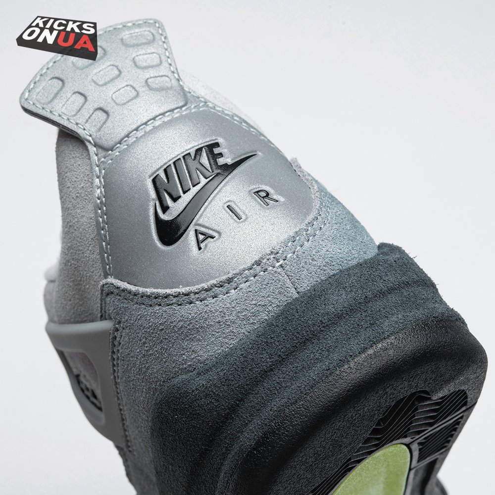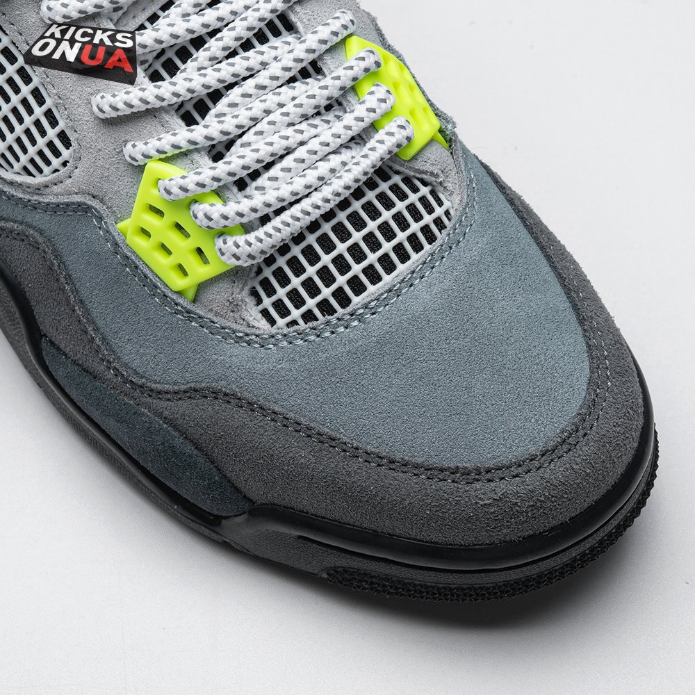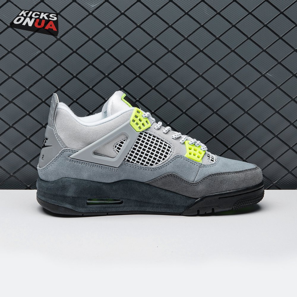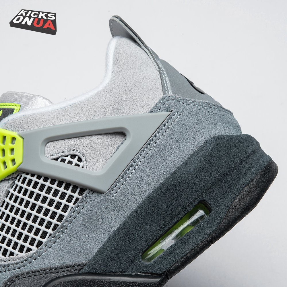 The Air Jordan 4 Retro SE 'Neon 95' draws inspiration from the iconic OG colorway of the Air Max 95, featuring varying shades of grey on the suede upper. Vibrant pops of neon yellow appear on the eyelets, quarter panel netting and the Nike Air logo that adorns the molded heel panel. The mid-top rides on a solid black midsole, fitted with a visible Air sole unit in the heel tinted neon yellow.