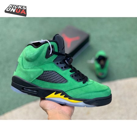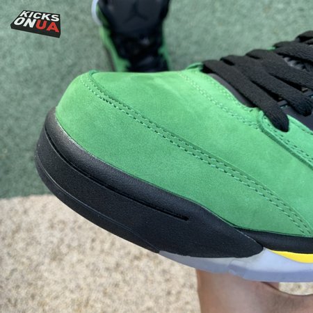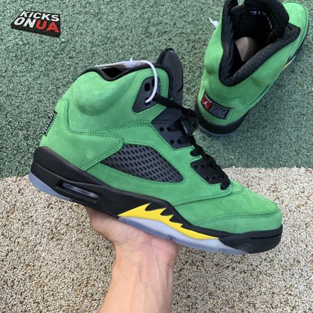 The Air Jordan 5 Retro SE "Oregon" features a distinctive color scheme paying tribute to the Oregon Ducks. Like the university"s PE edition, the shoe uses a green suede upper accented with a Team Jordan woven tag on the heel and contrasting black hits on the eyelets, tongue and quarter panel netting. The mid-top rides on a black foam midsole, accented with yellow shark tooth detailing and reinforced with a translucent rubber outsole.