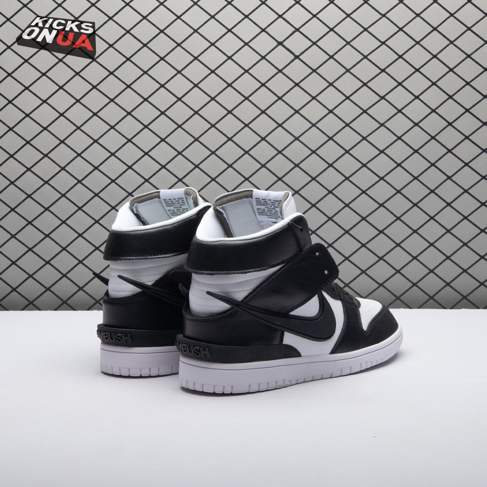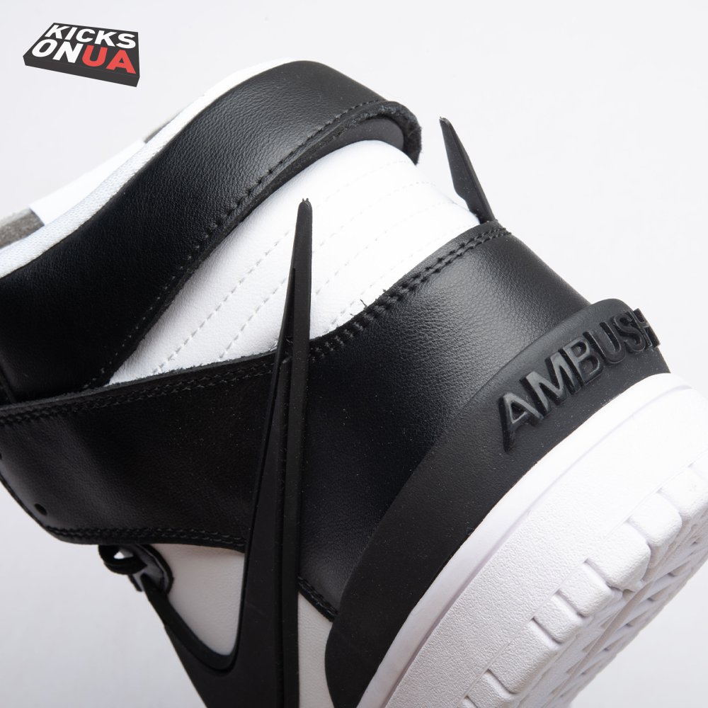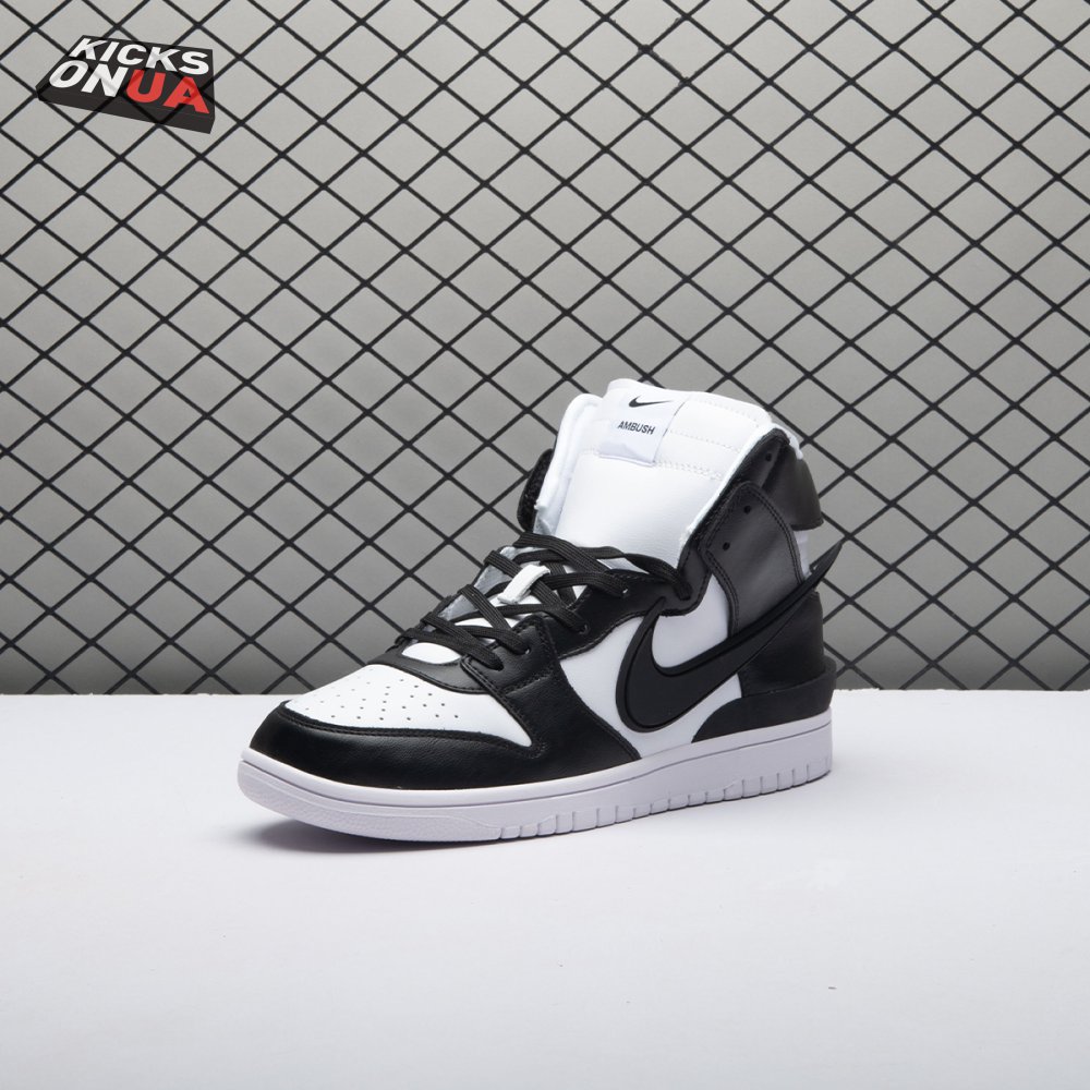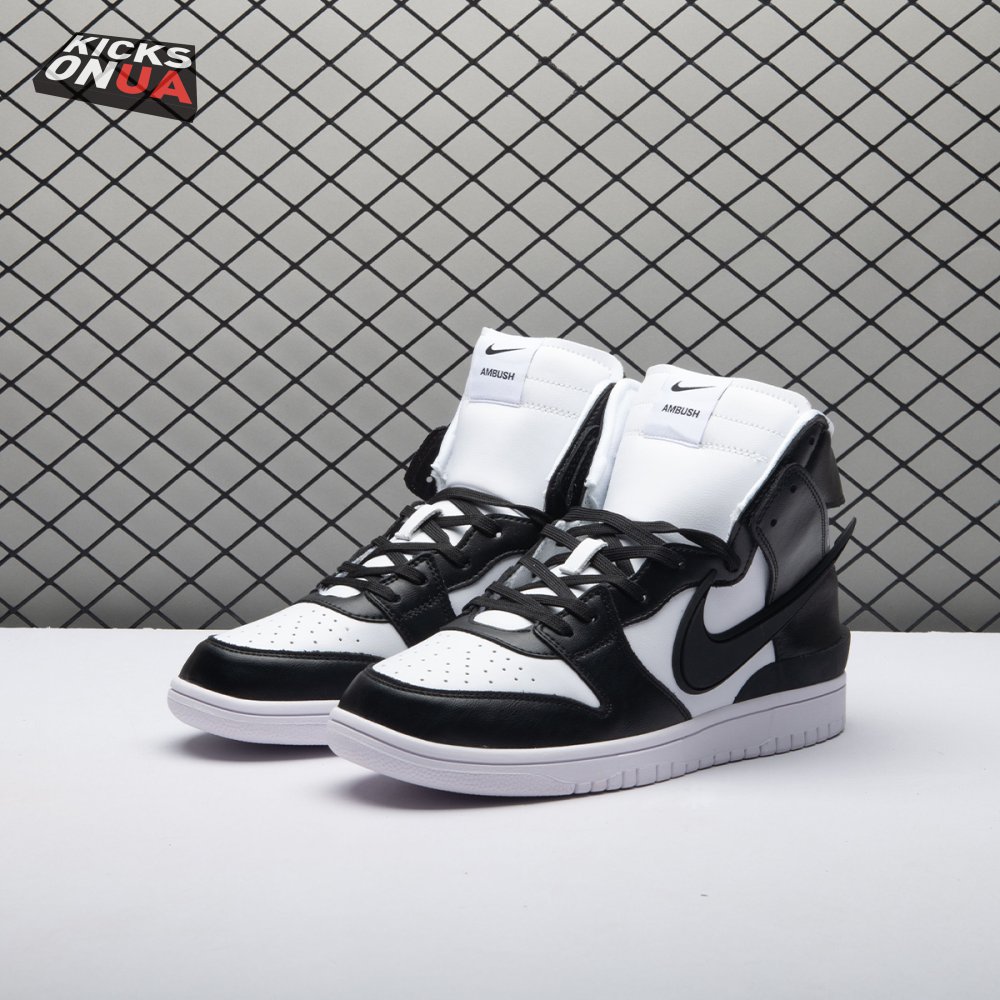 Designed as a joint venture with the Tokyo-based fashion label, the AMBUSH x Nike Dunk High "Black" applies an essential two-tone color scheme to a reconstituted leather build with exaggerated details. The latter is highlighted by an oversized, elongated Swoosh, its pointed tail extending past the back of the shoe to convey a dynamic sense of movement. AMBUSH branding decorates an added TPU heel counter and a woven tag atop the sneaker"s exposed foam tongue.