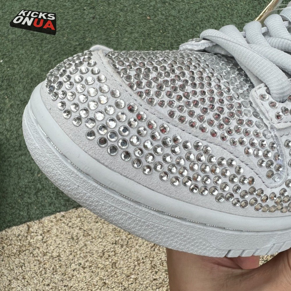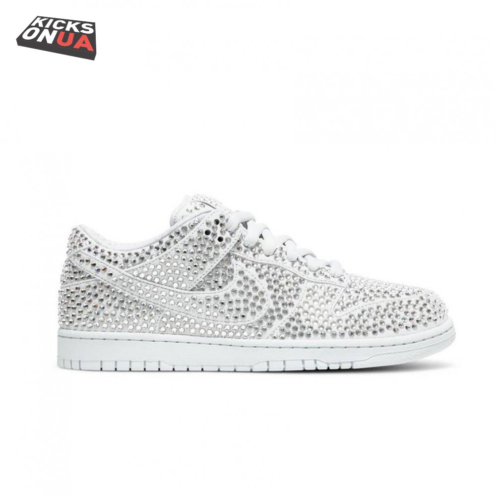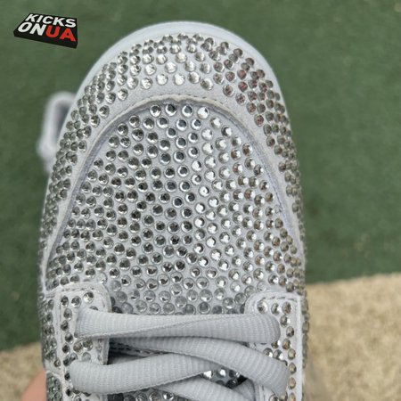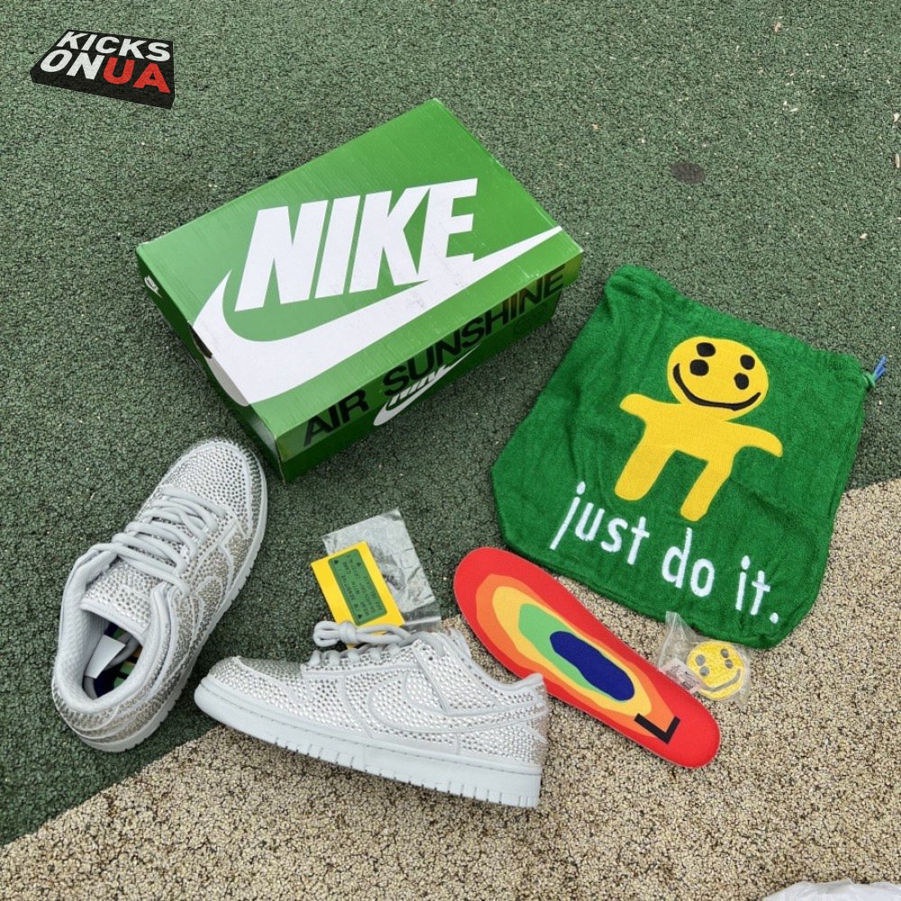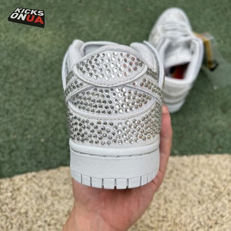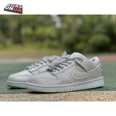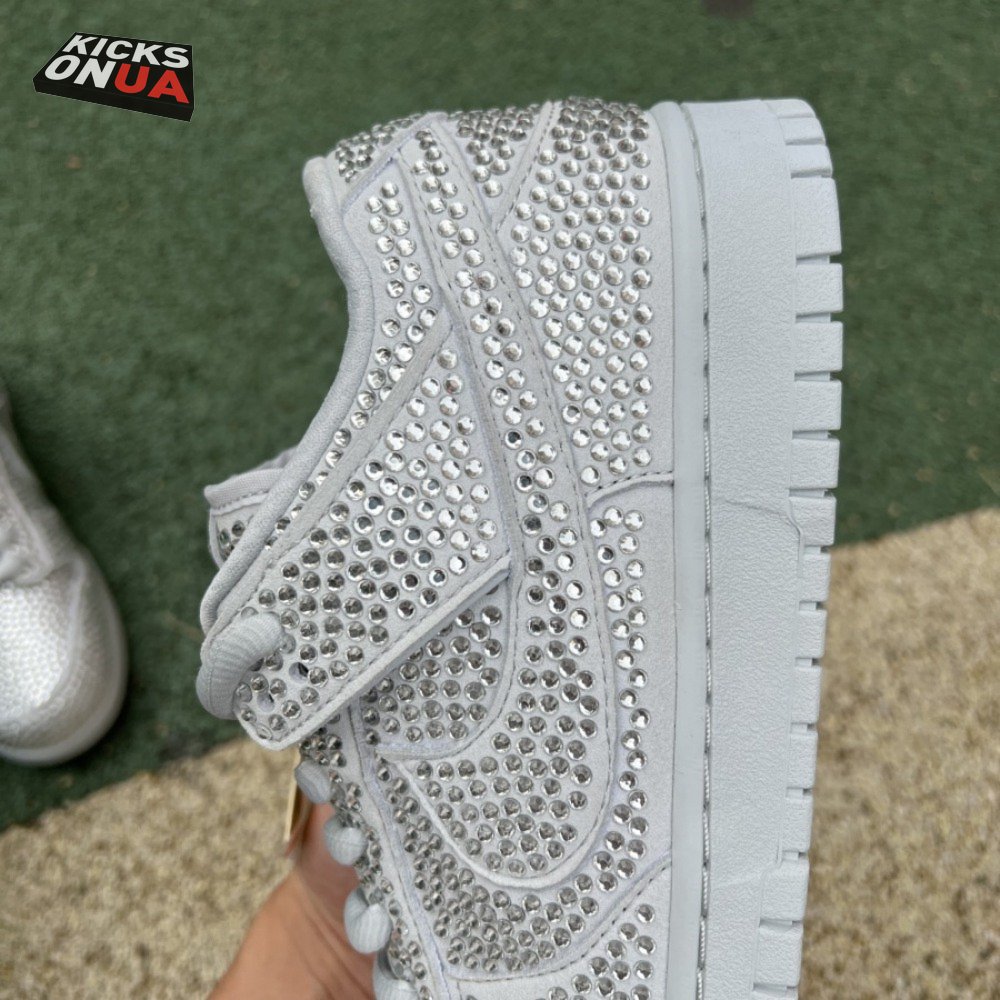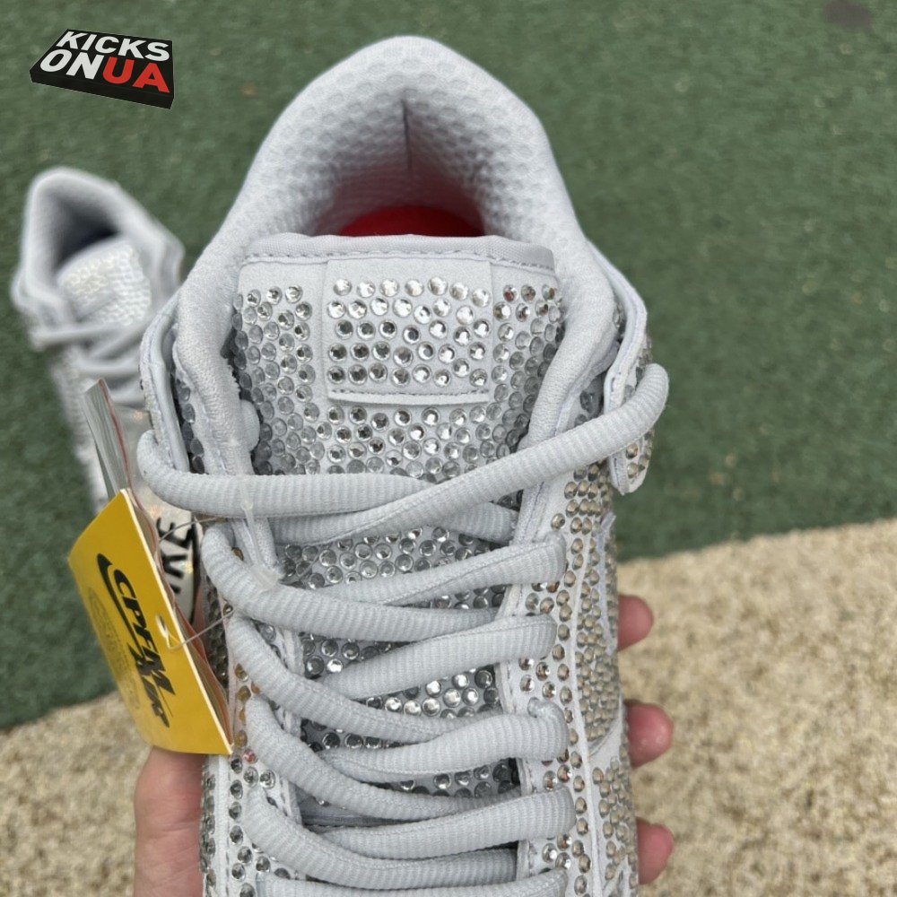 Designed in partnership with the LA-based streetwear brand, the Cactus Plant Flea Market x Swarovski x Nike Dunk Low "Pure Platinum" delivers an opulent take on the classic silhouette. Every inch of the suede upper is entirely covered in Swarovski crystals, including the detachable double lace flaps, heavily padded tongue and oversized Swoosh, the latter borrowed from CPFM"s previous Nike Blazer collaboration from 2019.