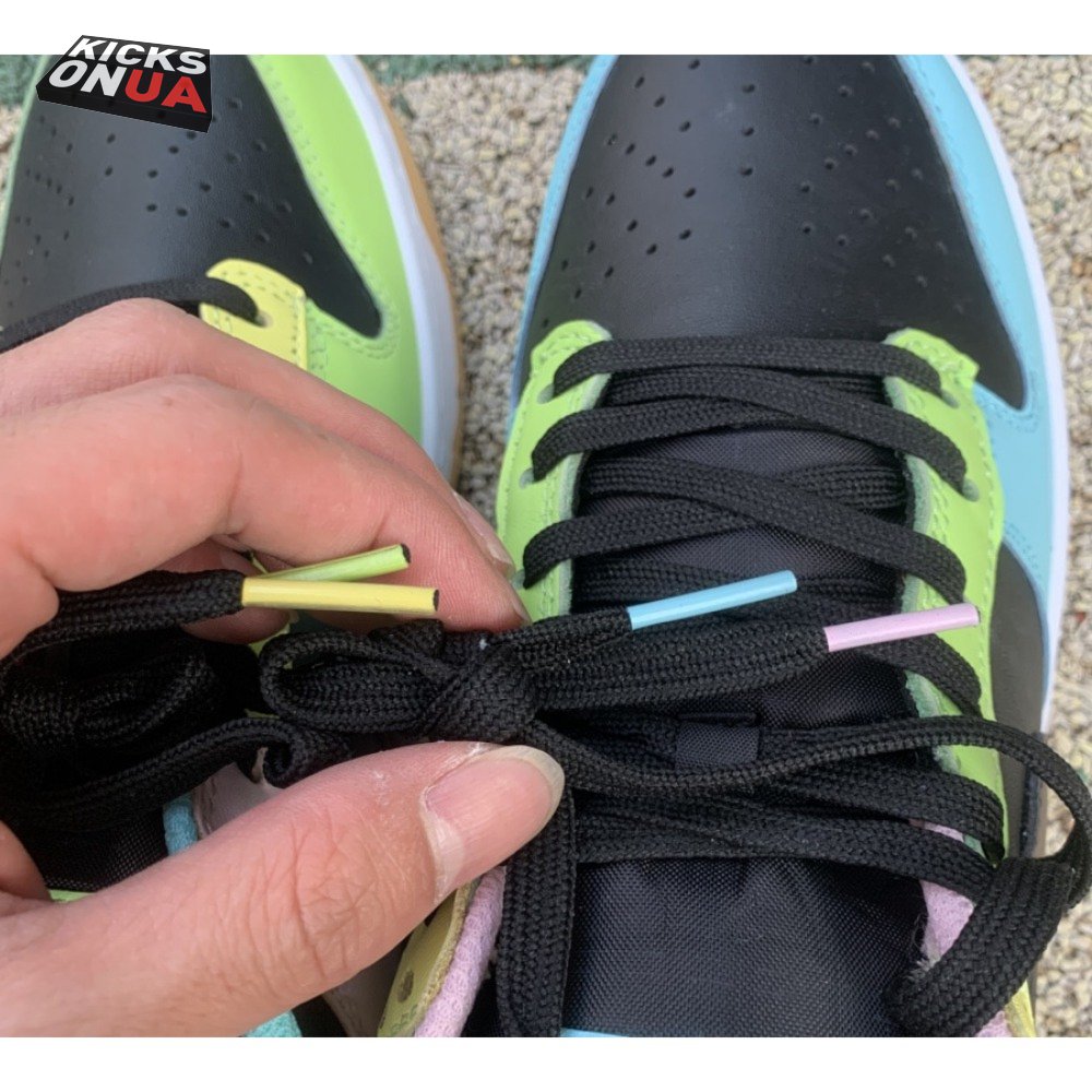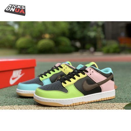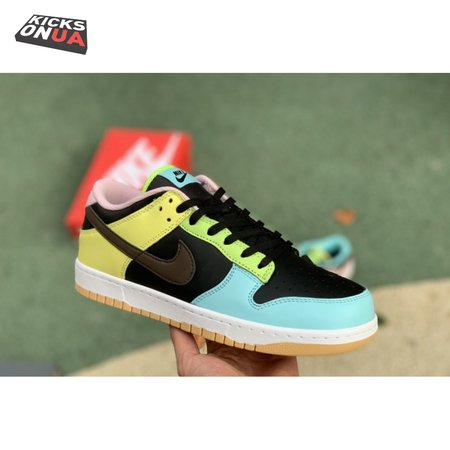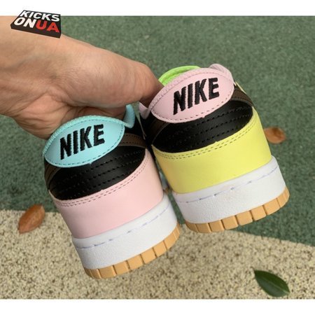 The Nike Dunk Low SE "Free.99 - Black" applies mismatched color blocking to the vintage hoops shoe turned streetwear staple. Both the left and right shoe feature a black leather base on the upper, supported by a crisp white midsole and pale orange rubber outsole. While the overlays on each shoe are arranged in asymmetrical fashion, they draw from the pastel palette of powder blue, pink, yellow and line green hues. The custom sockliner displays "Free.99" price stickers.