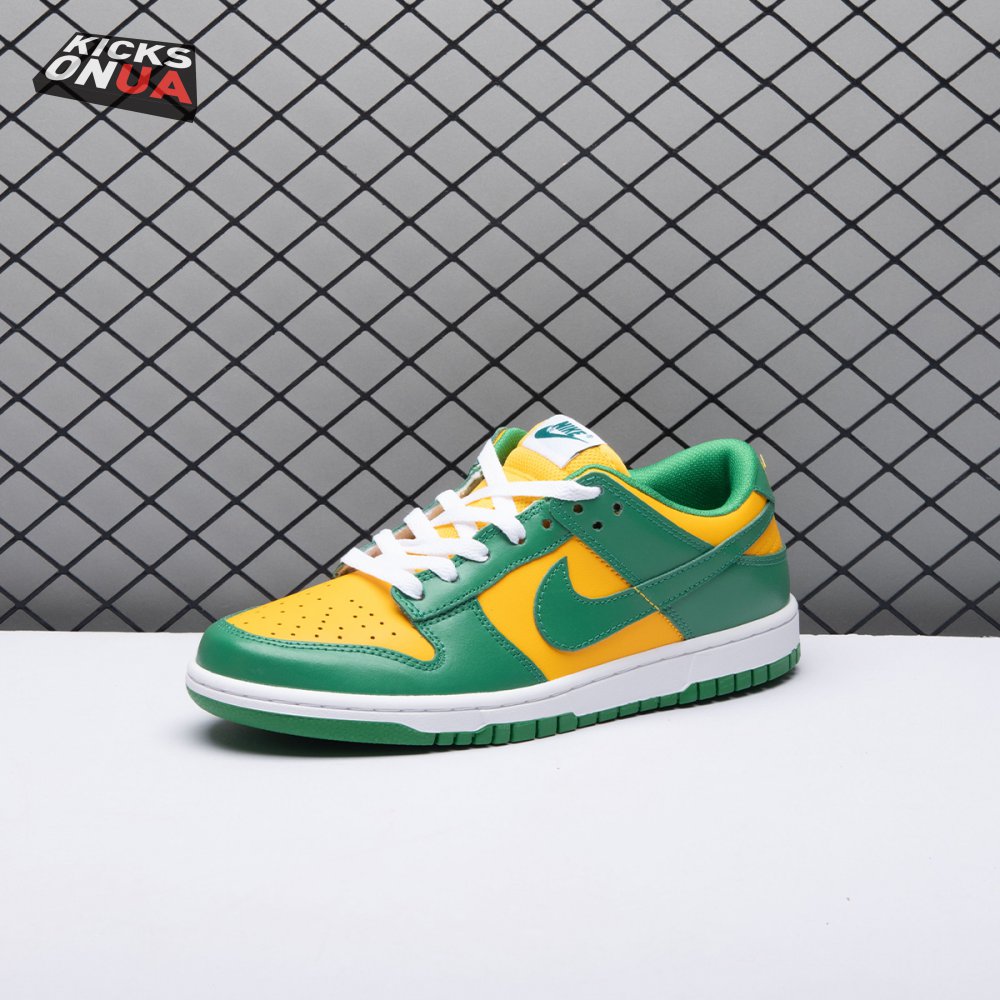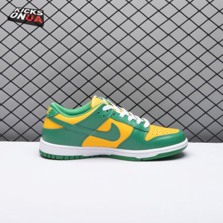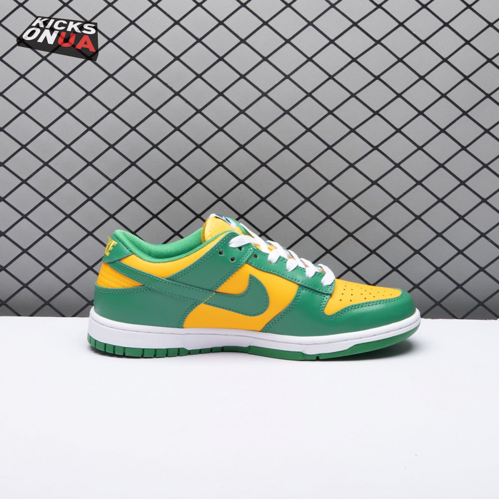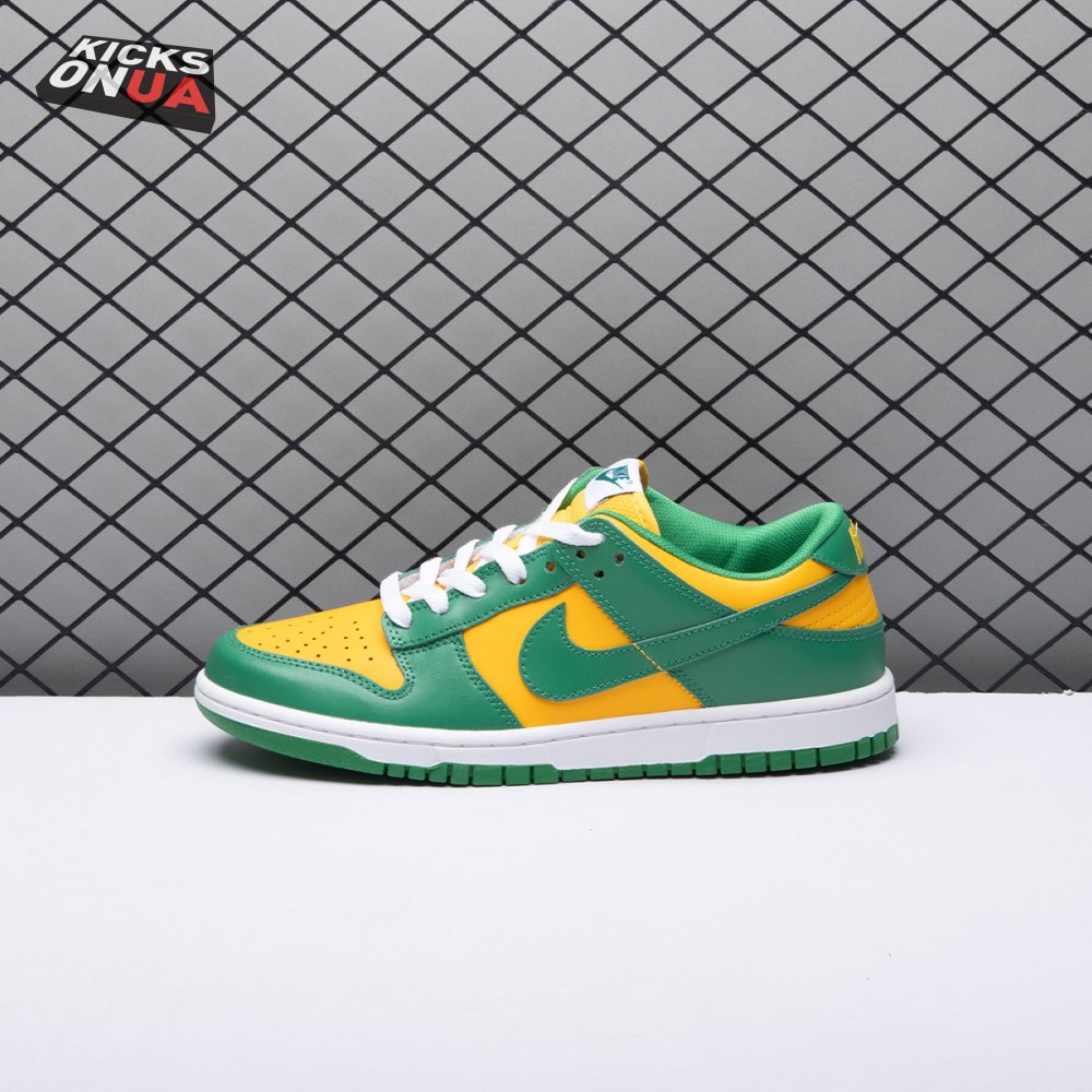 The Nike Dunk Low SP "Brazil" replicates the look of the classic "Brazil" Dunk from 2001, featuring a simple two-tone color scheme that combines a yellow leather base with contrasting green overlays. Nike branding adorns the heel tab and stitched-on woven tag atop the lightly padded nylon tongue. The low-profile silhouette is mounted on a sturdy white foam midsole, reinforced underfoot by a green rubber outsole.