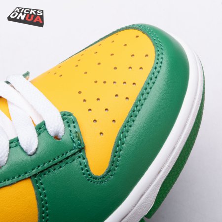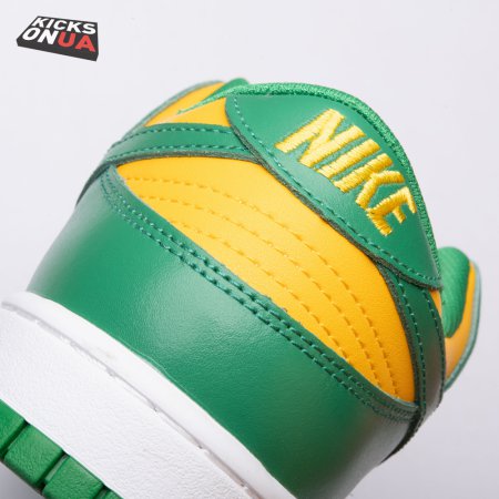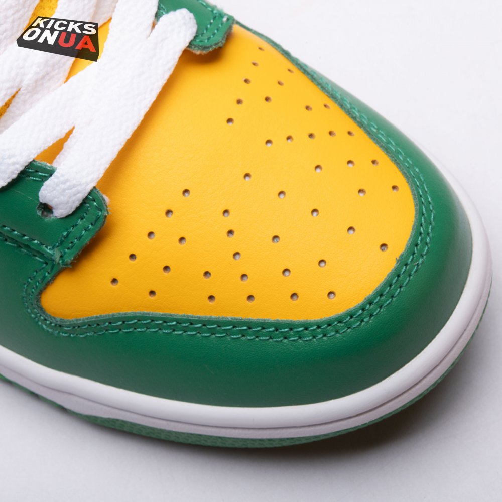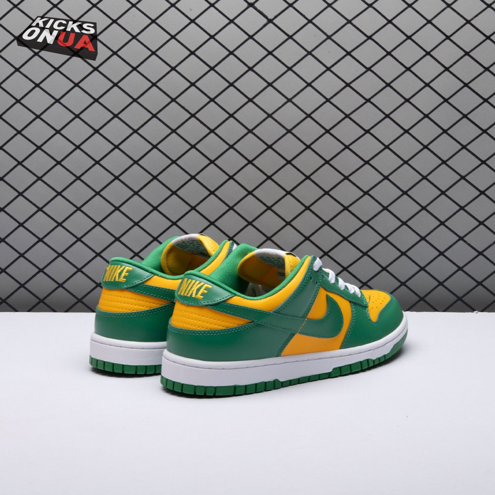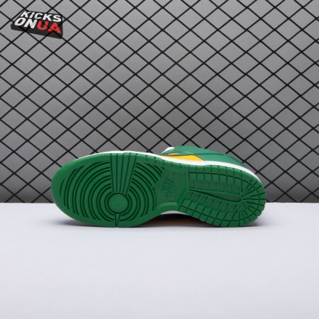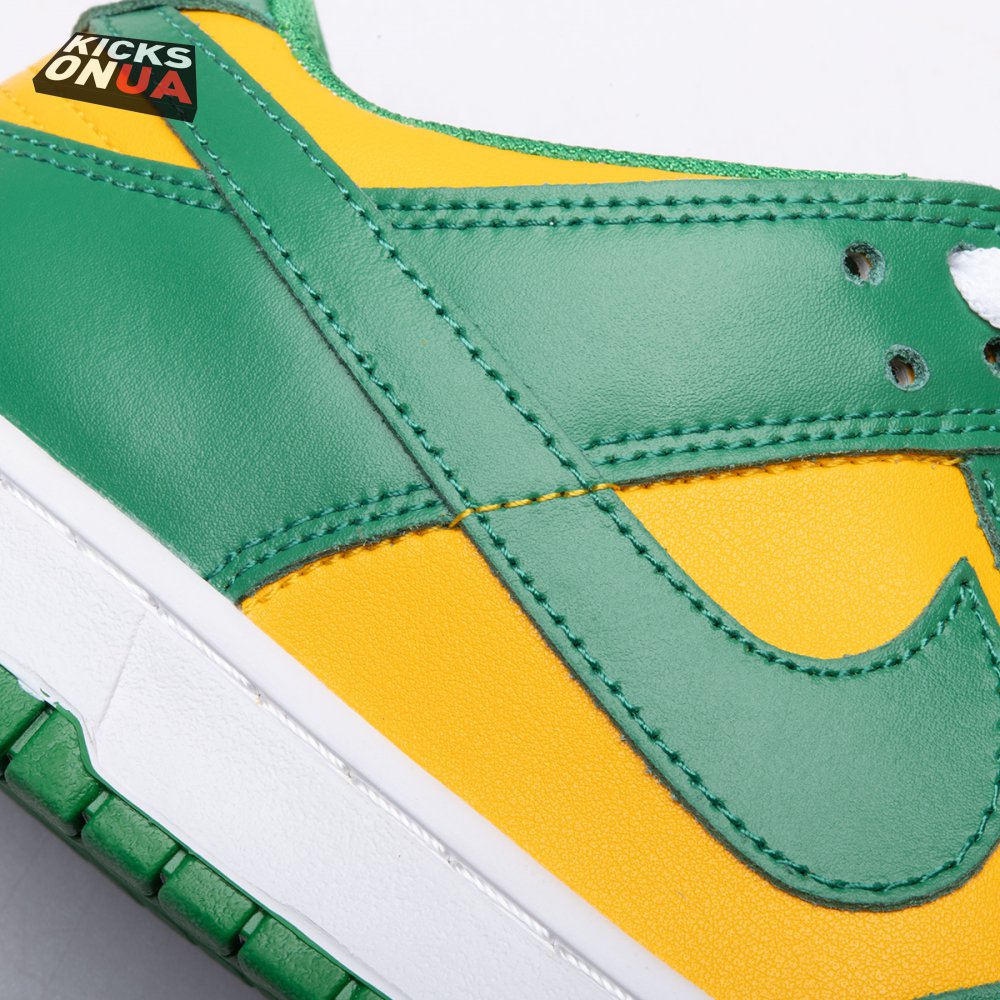 The Nike Dunk Low SP "Brazil" replicates the look of the classic "Brazil" Dunk from 2001, featuring a simple two-tone color scheme that combines a yellow leather base with contrasting green overlays. Nike branding adorns the heel tab and stitched-on woven tag atop the lightly padded nylon tongue. The low-profile silhouette is mounted on a sturdy white foam midsole, reinforced underfoot by a green rubber outsole.