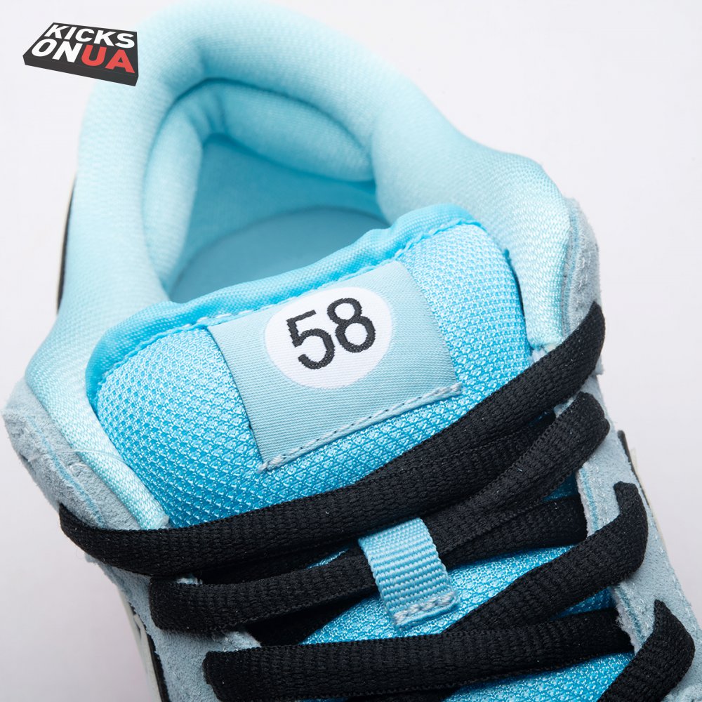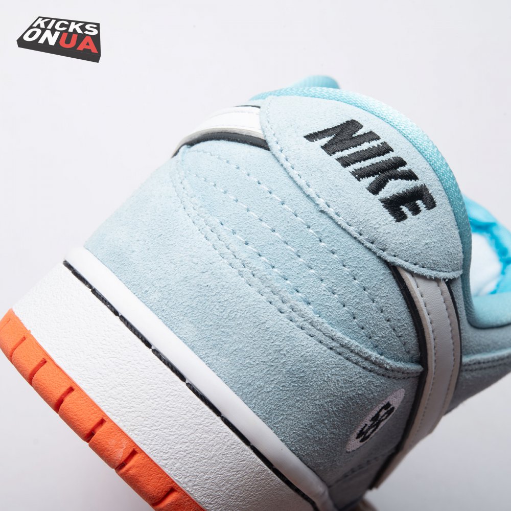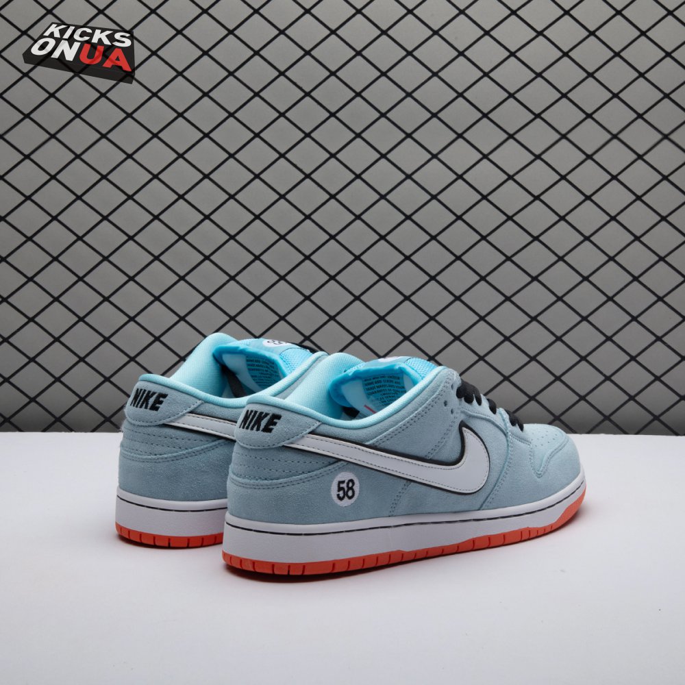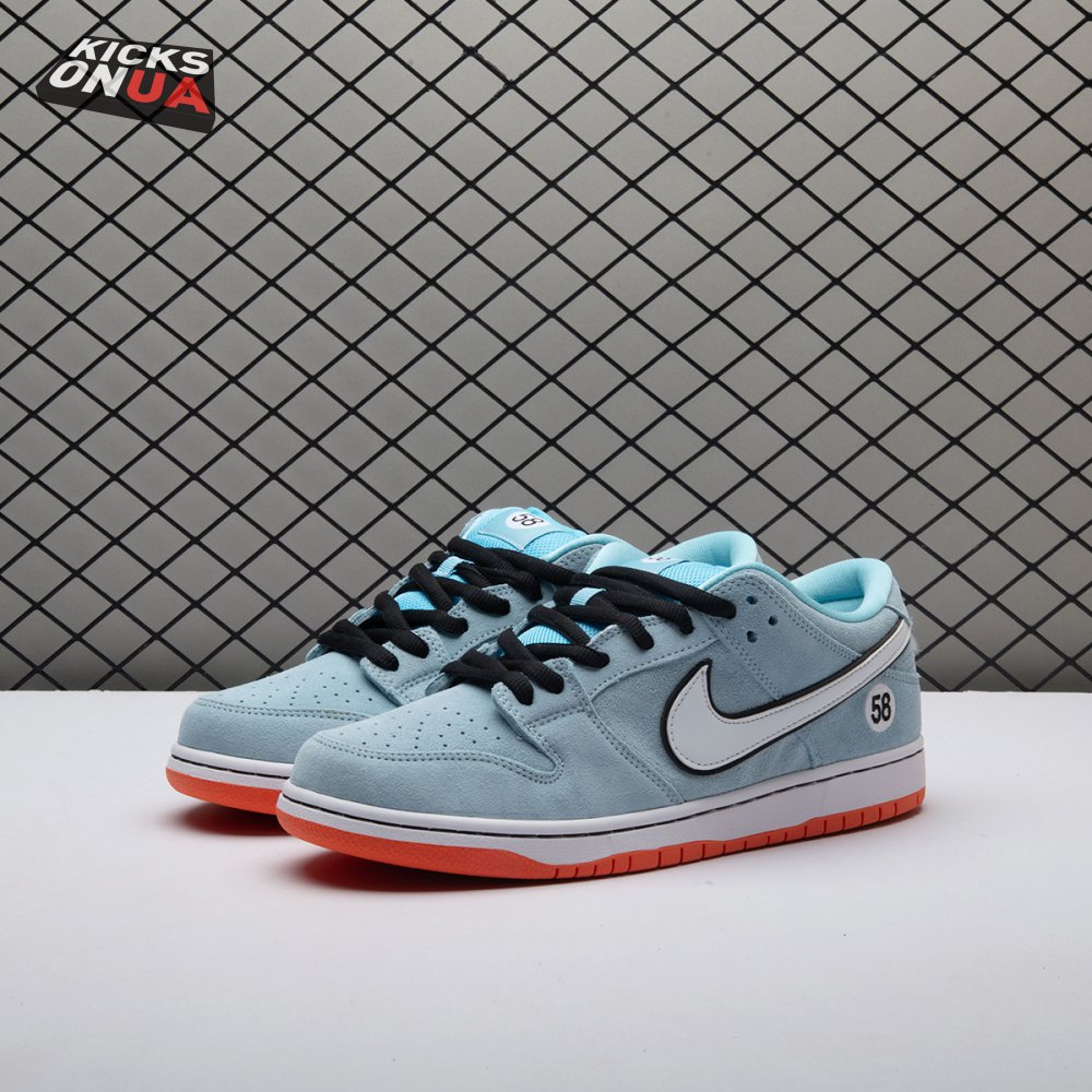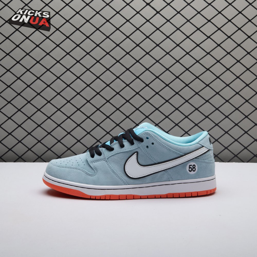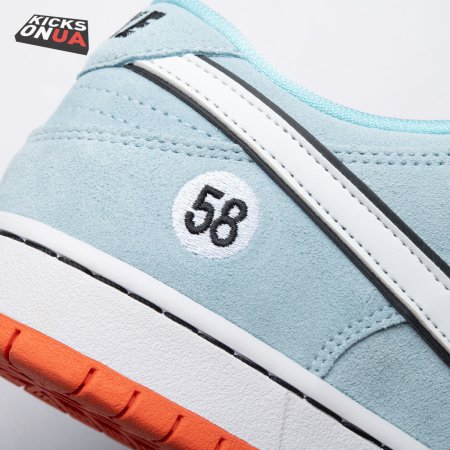 The Nike Dunk Low Pro SB 'Gulf" is the follow-up to the Blazer Mid "Club 58" from 2018, both of which are designed in collaboration with a consortium of four prominent skate shops located in Western Europe. Light blue suede is utilized throughout the upper, accented with a white leather Swoosh and a circular 58 graphic on the lateral heel. The digits are repeated on the woven tag affixed to the stuffed mesh tongue. Underfoot, a bright orange rubber outsole delivers a contrasting pop of color.