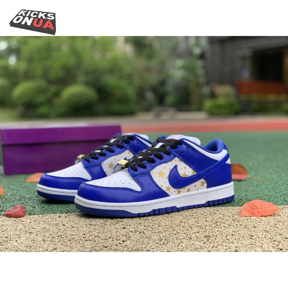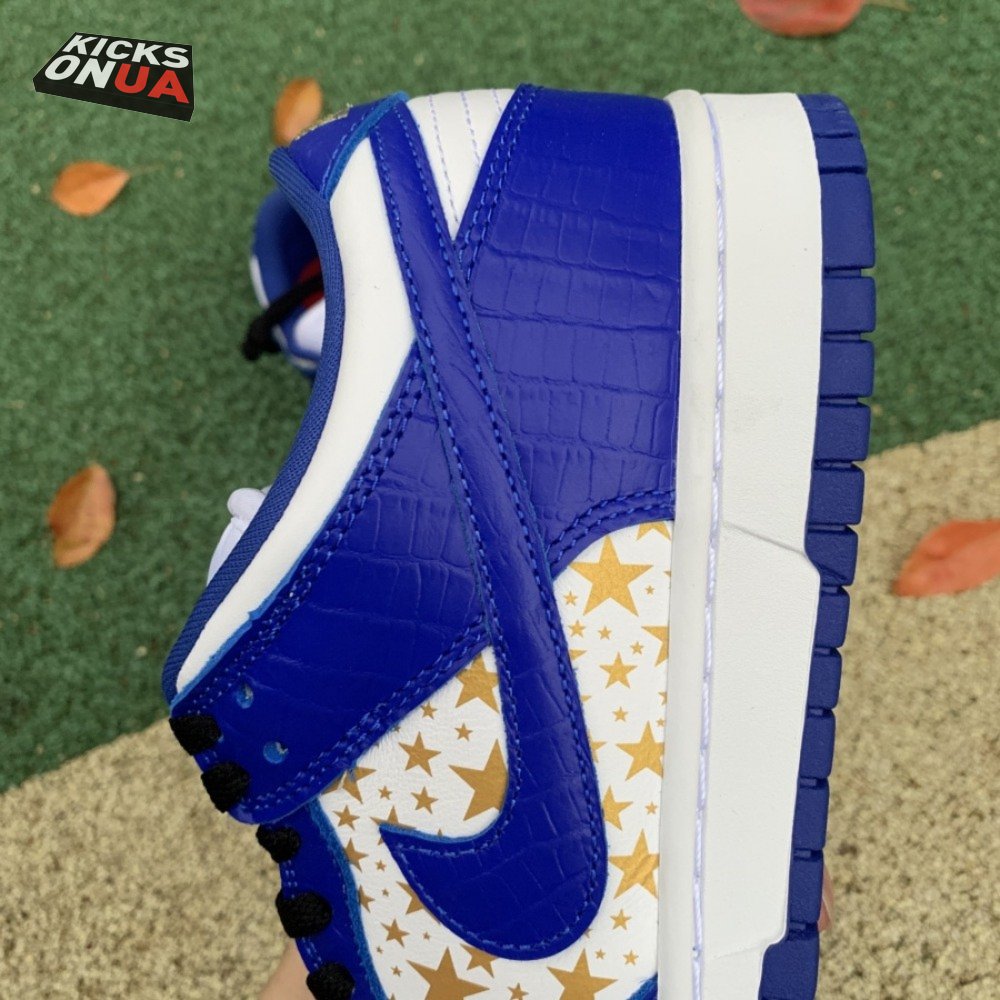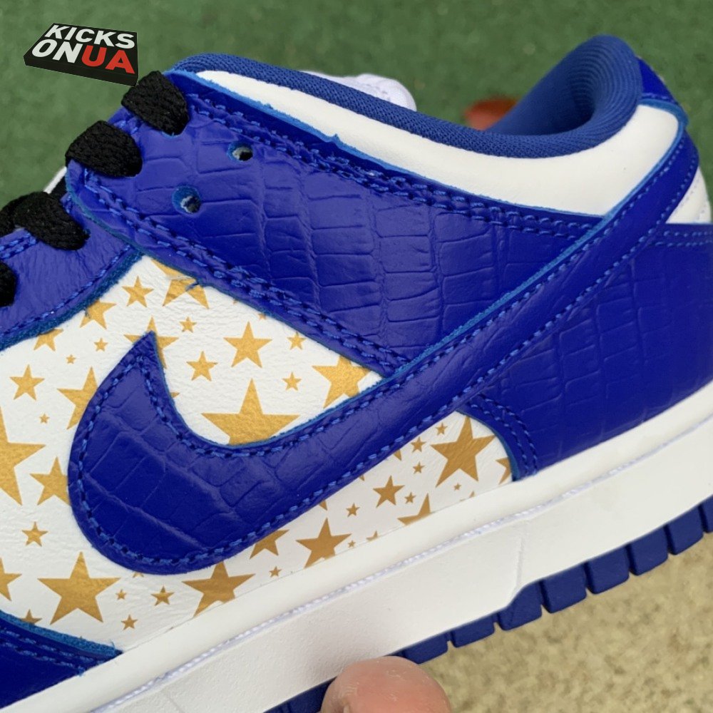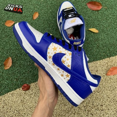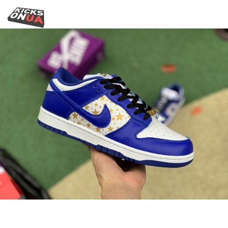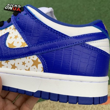 The Supreme x Nike Dunk Low OG SB QS "Hyper Royal" takes direct inspiration from the New York skate brand"s Dunk High collaboration from 2003. Like the high-top, this pair features a white leather base with metallic gold stars on the quarter panels and croc-embossed leather overlays in a contrasting hue. A standard Nike wordmark is embroidered in gold lettering on the heel tab, matching the woven tag atop the stuffed textile tongue. A gold Supreme dubrae shines at the bottom of the lace bed. Lightweight cushioning is provided by a Zoom Air-infused sockliner, its crimson surface embellished with dual Supreme and Nike SB branding.