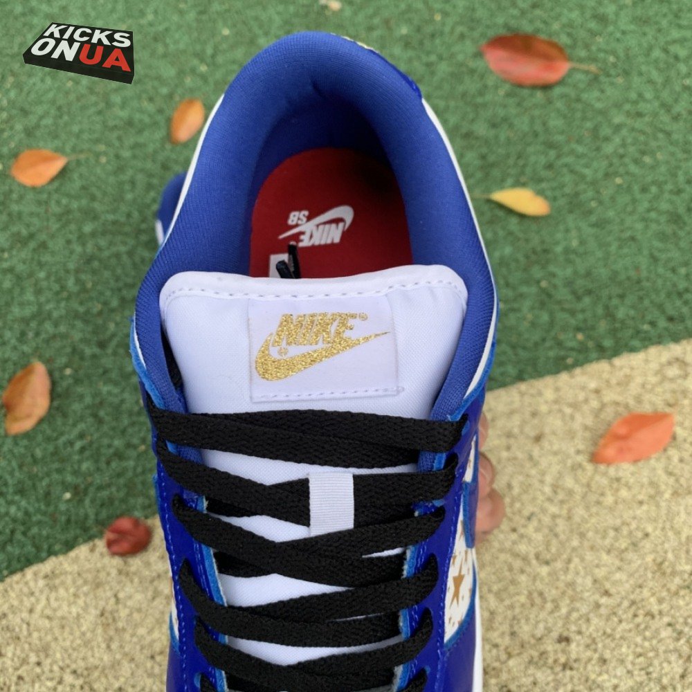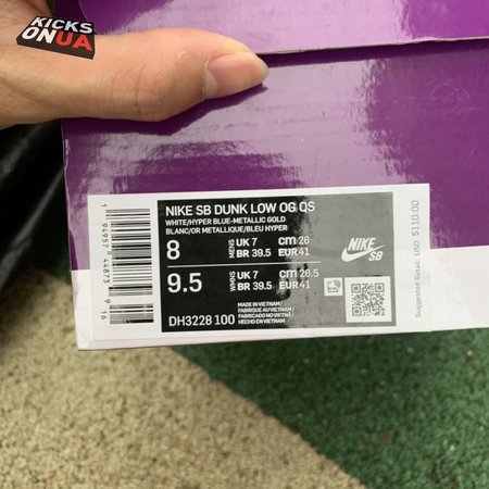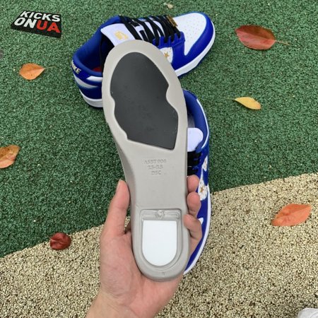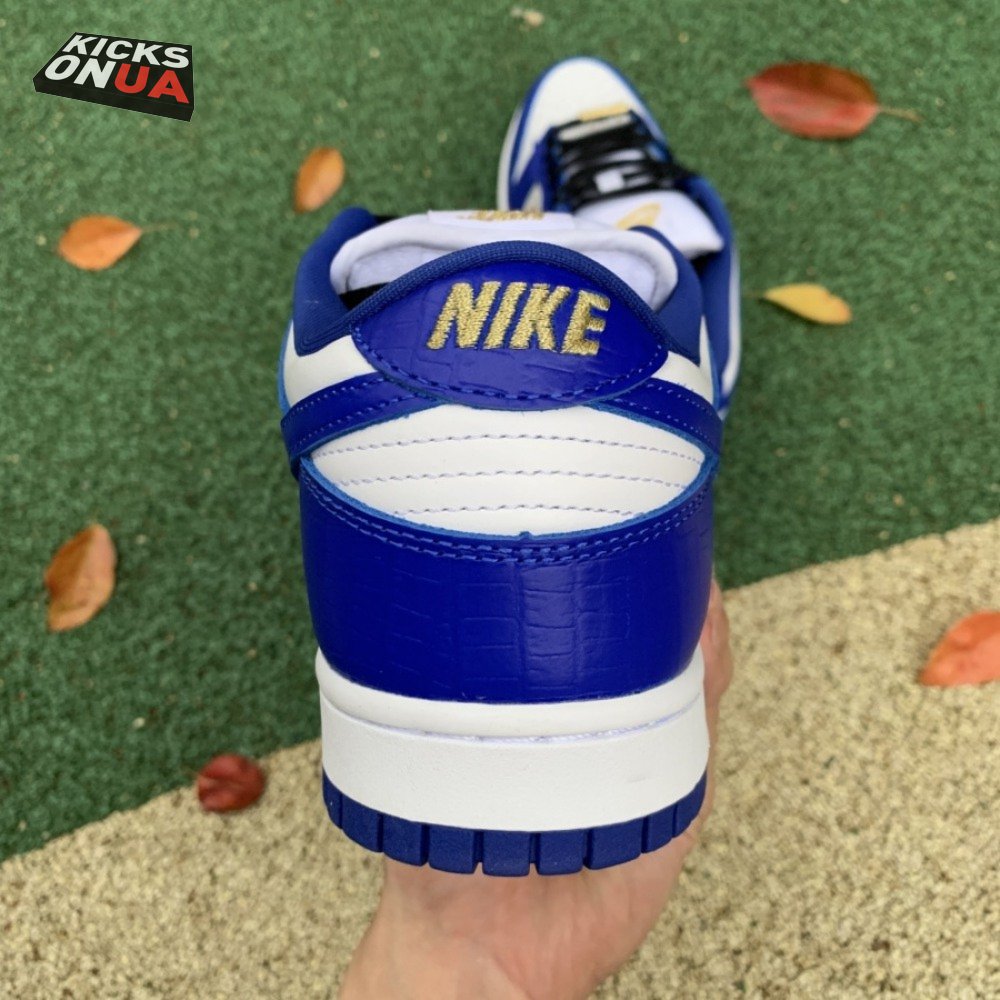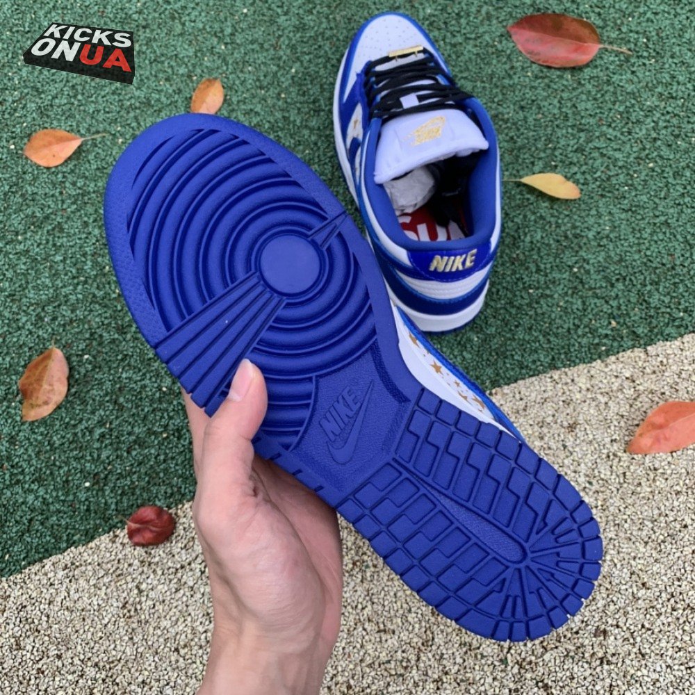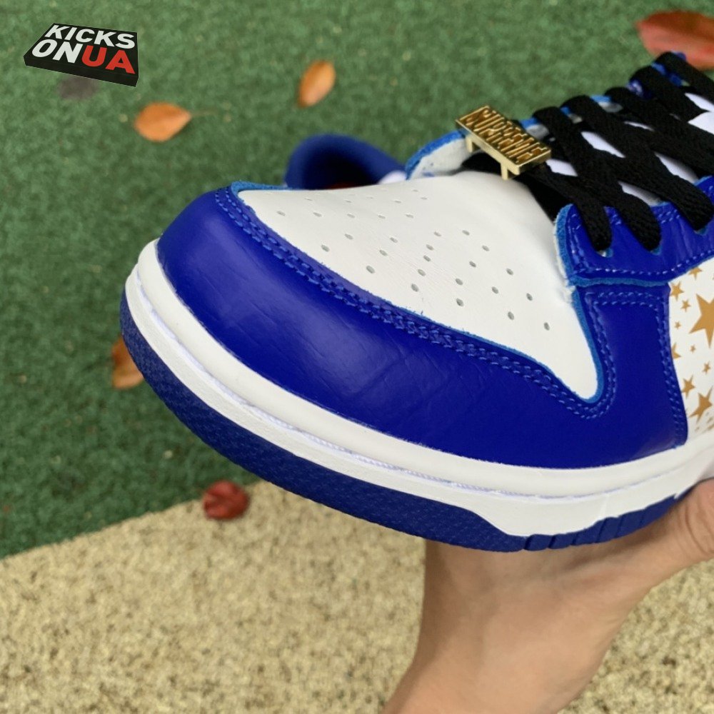 The Supreme x Nike Dunk Low OG SB QS "Hyper Royal" takes direct inspiration from the New York skate brand"s Dunk High collaboration from 2003. Like the high-top, this pair features a white leather base with metallic gold stars on the quarter panels and croc-embossed leather overlays in a contrasting hue. A standard Nike wordmark is embroidered in gold lettering on the heel tab, matching the woven tag atop the stuffed textile tongue. A gold Supreme dubrae shines at the bottom of the lace bed. Lightweight cushioning is provided by a Zoom Air-infused sockliner, its crimson surface embellished with dual Supreme and Nike SB branding.