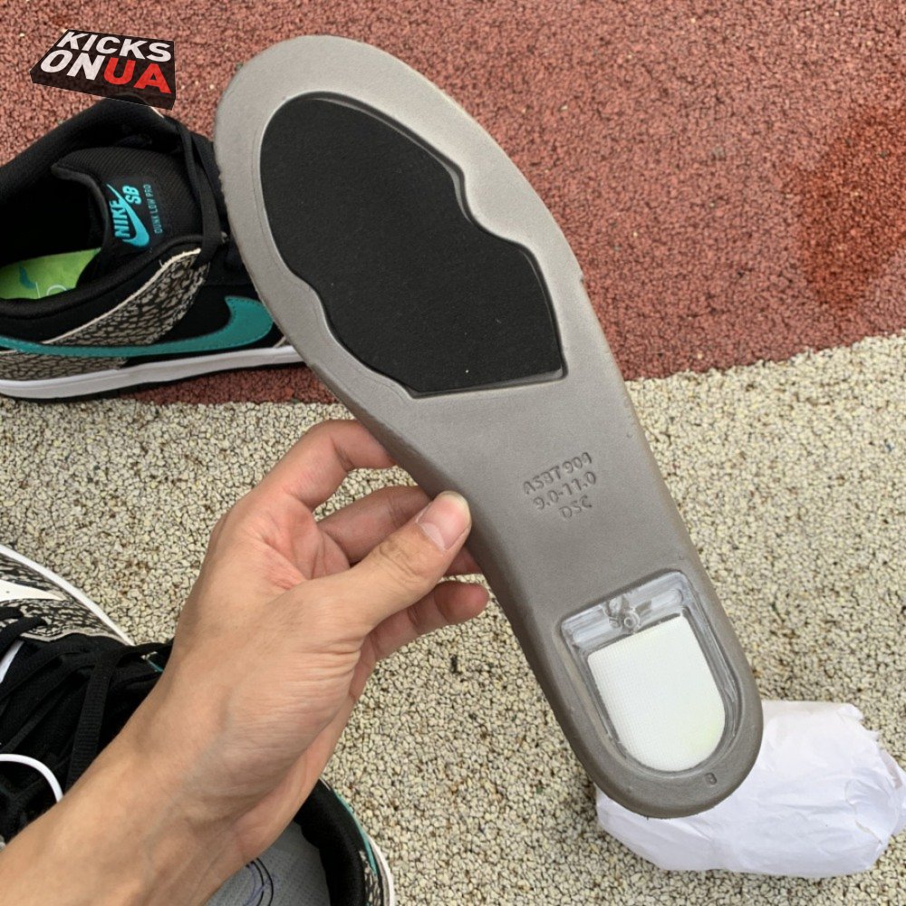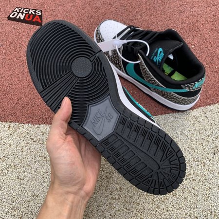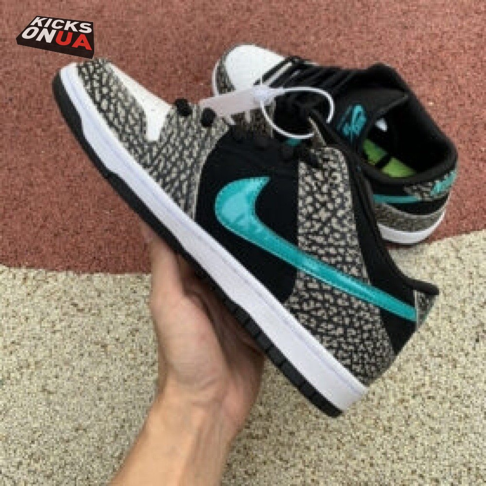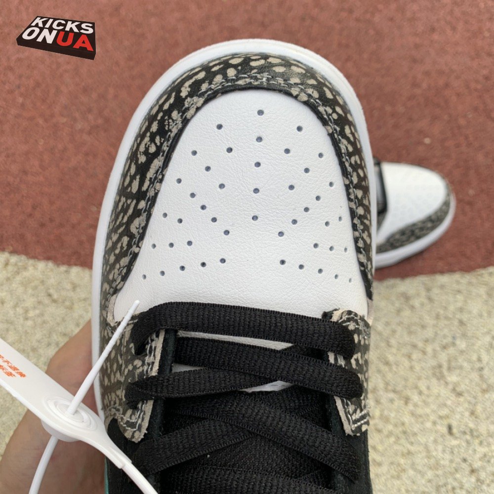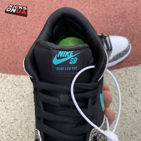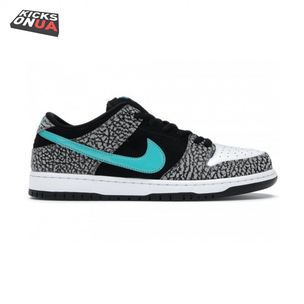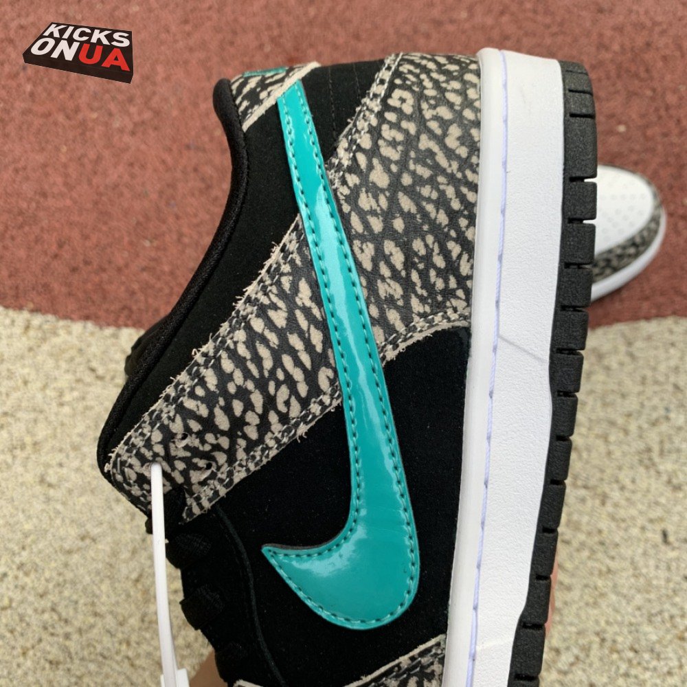 The Nike Dunk Low Pro SB "Atmos Elephant" showcases a familiar design reminiscent of Atmos" highly coveted Air Max 1 collaboration, originally released in 2006 and reissued in 2017. The low-top features a perforated white leather toe box, black suede quarter panel and grey elephant-print overlays along the forefoot and heel. The signature Swoosh stands out in Clear Jade, matching Nike branding hits at the heel tab and woven tongue tag.
