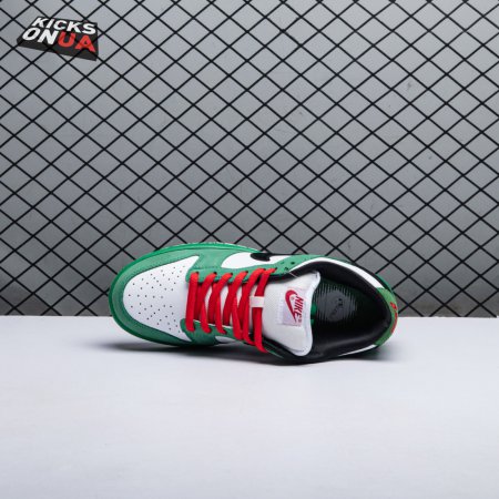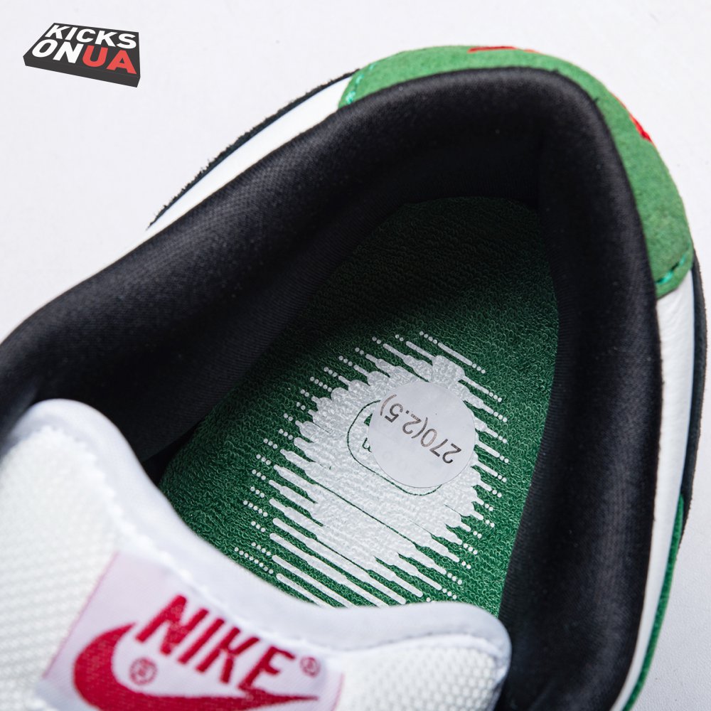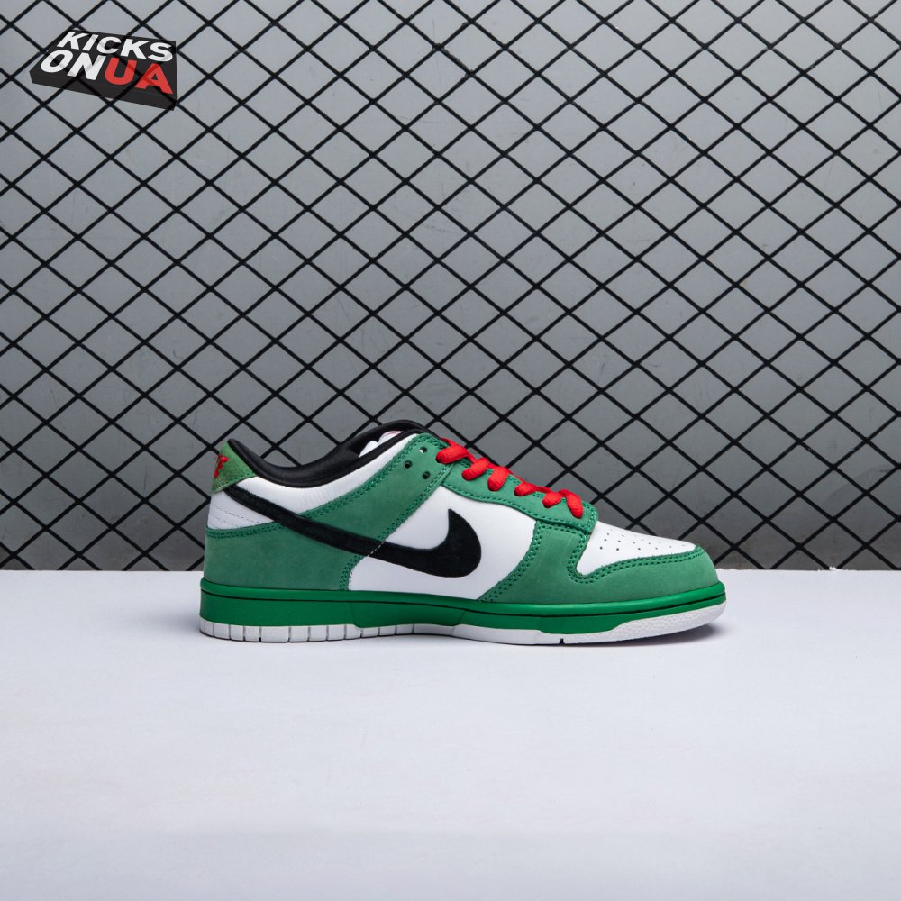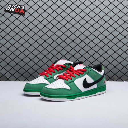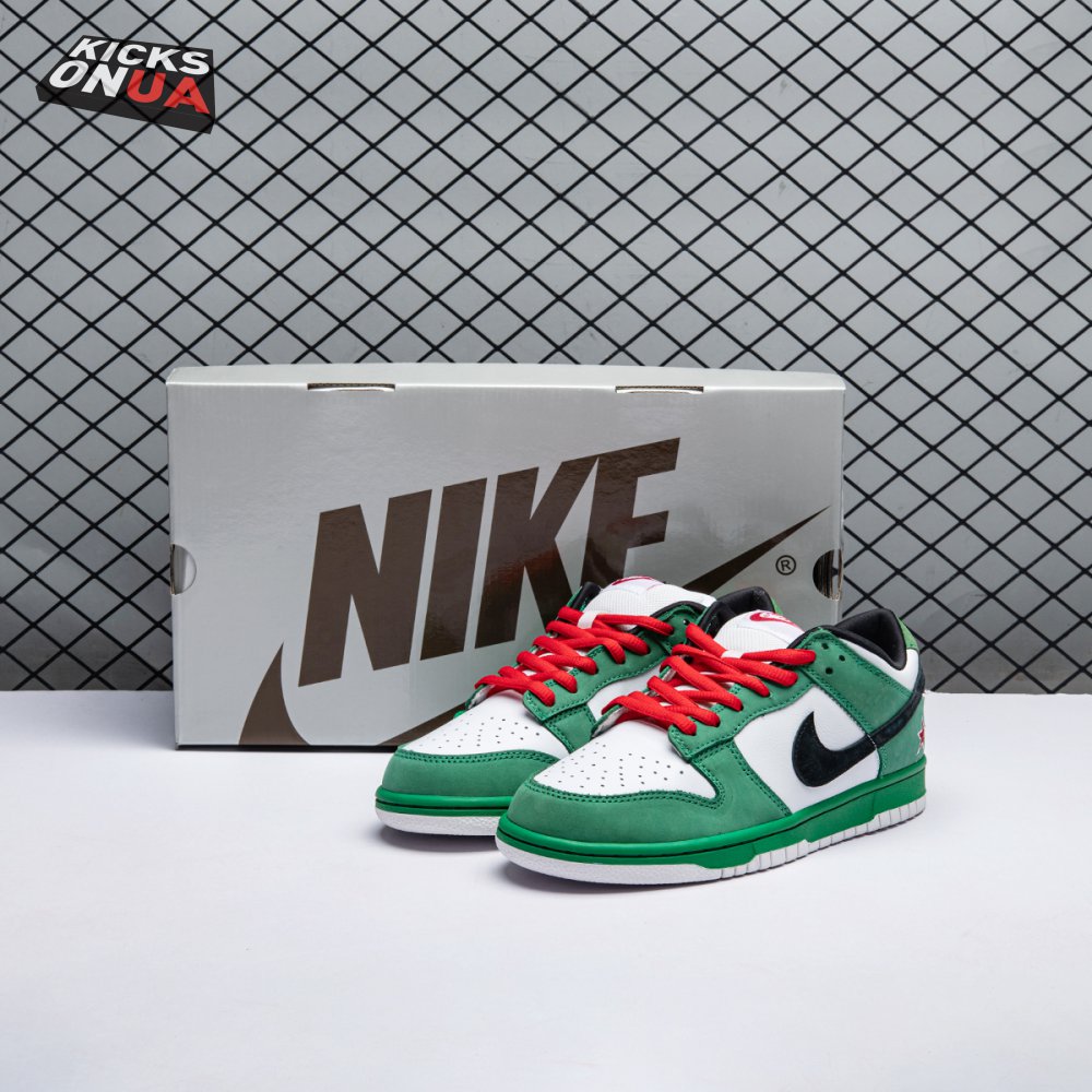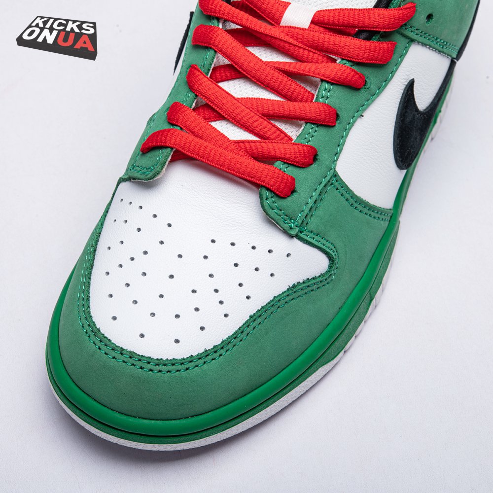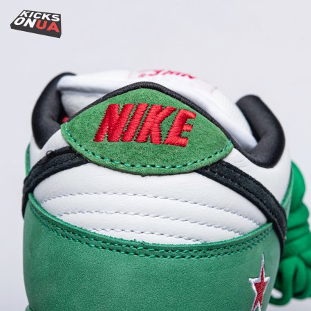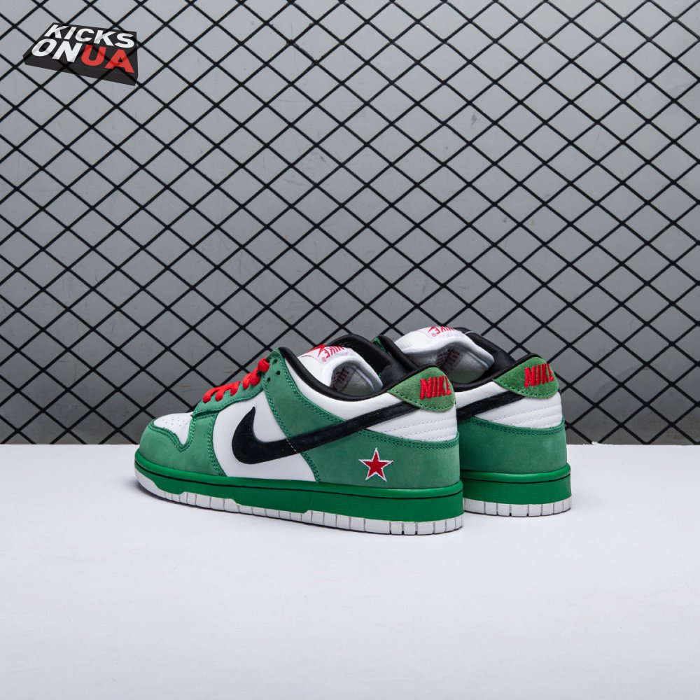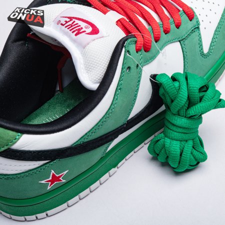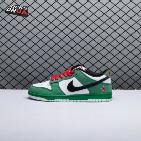 The Dunk Low Pro SB "Heineken" takes inspiration from the signature green bottles used by the Dutch beer brand. The low-top sports a white leather upper with green nubuck overlays and a black suede Swoosh. The color scheme up top is repeated on the shoe"s tooling, featuring a green midsole and crisp white outsole. Bordered in white, an embroidered red star graces the lateral heel.
