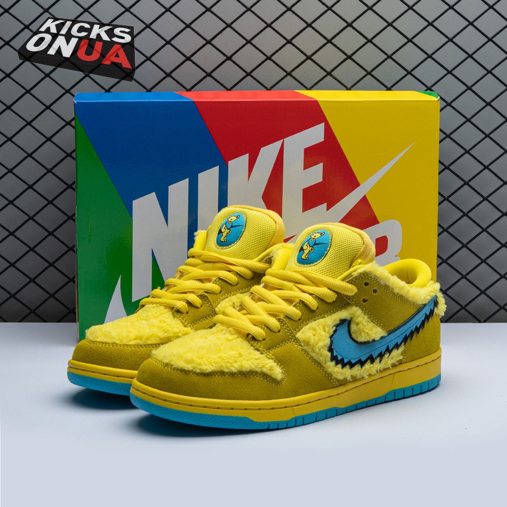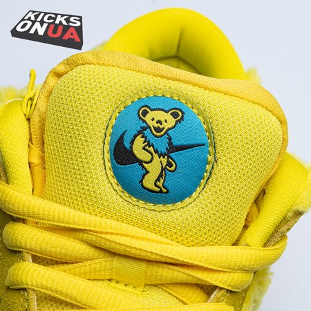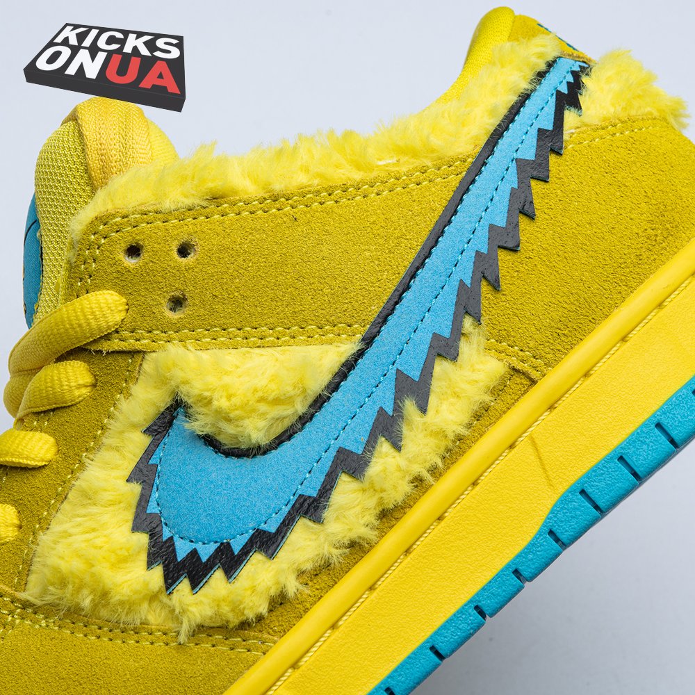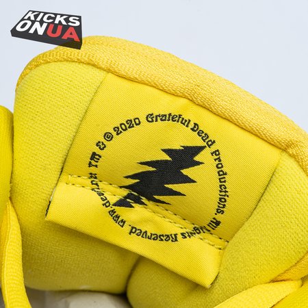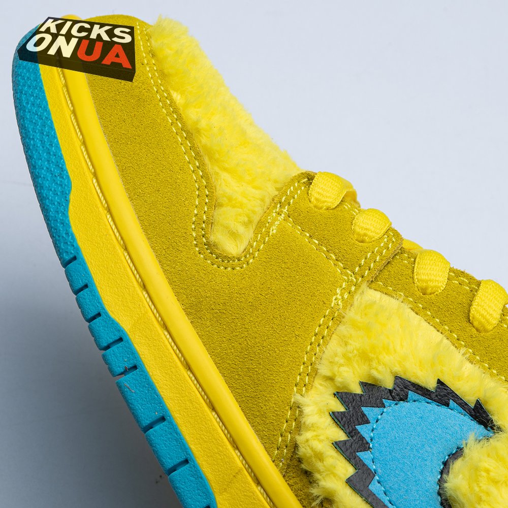 Developed in collaboration with the iconic San Francisco jam band, the Grateful Dead x Nike Dunk Low SB "Yellow Bear" features a unique design inspired by the back cover of "History of the Grateful Dead, Volume One (Bear"s Choice)," a live album originally released in 1973. A vibrant yellow finish is applied to the furry upper, fortified with tonal suede overlays and mounted atop a matching yellow foam midsole. Contrasting blue hits appear on the jagged Swoosh, rubber outsole and tongue, the latter furnished with a hidden stash pocket.