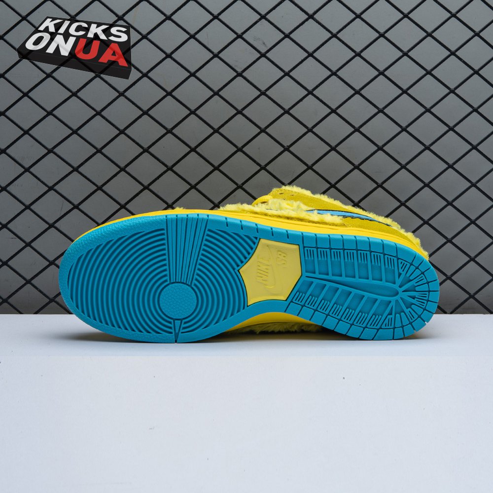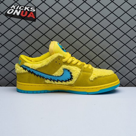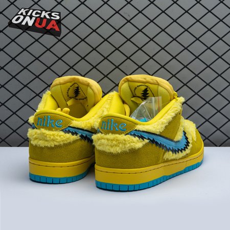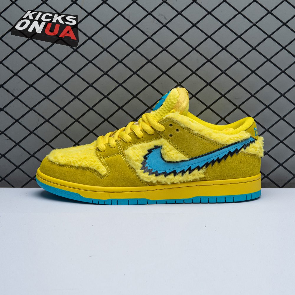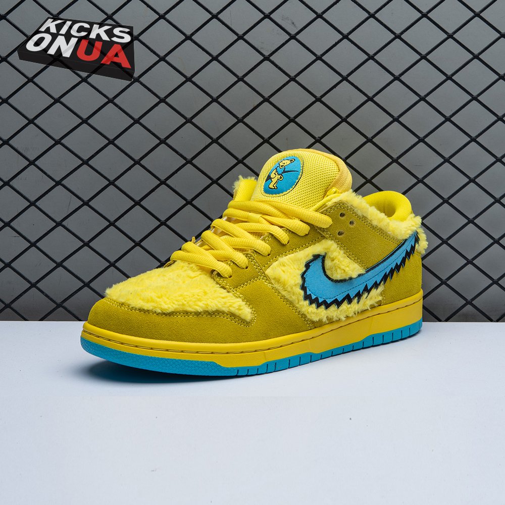Developed in collaboration with the iconic San Francisco jam band, the Grateful Dead x Nike Dunk Low SB "Yellow Bear" features a unique design inspired by the back cover of "History of the Grateful Dead, Volume One (Bear"s Choice)," a live album originally released in 1973. A vibrant yellow finish is applied to the furry upper, fortified with tonal suede overlays and mounted atop a matching yellow foam midsole. Contrasting blue hits appear on the jagged Swoosh, rubber outsole and tongue, the latter furnished with a hidden stash pocket.
