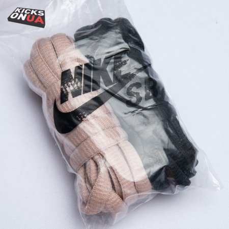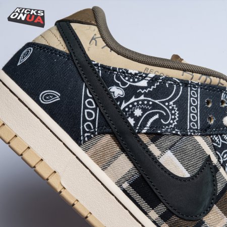 The Travis Scott x Dunk Low SB shows off a unique patchwork motif on the upper, featuring a tan leather base with plaid quarter panels and paisley print overlays, the latter made to tear away to reveal hidden elephant print underneath. The dueling patterns are complemented by rope laces, Cactus Jack tongue tags and mismatched black and pink Swooshes on each shoe. A white midsole and tan rubber outsole anchor the complex design.
