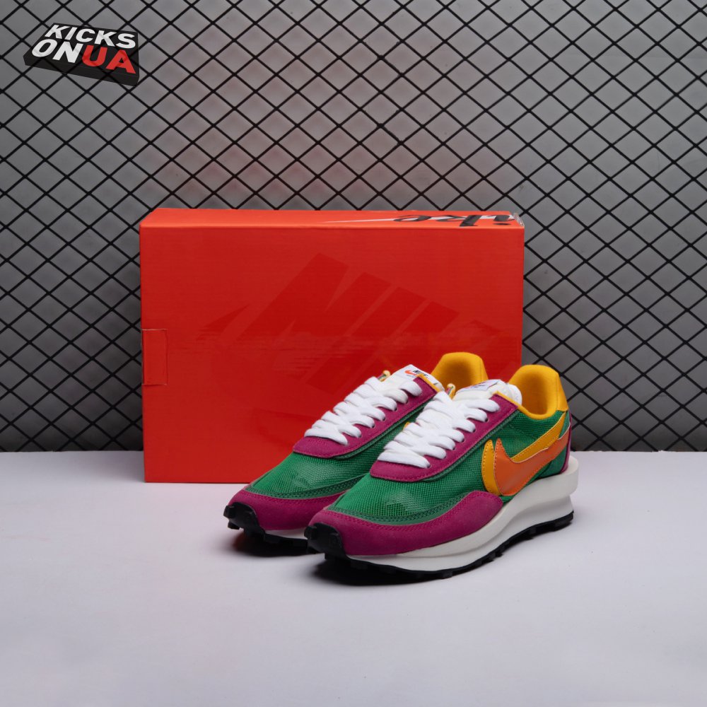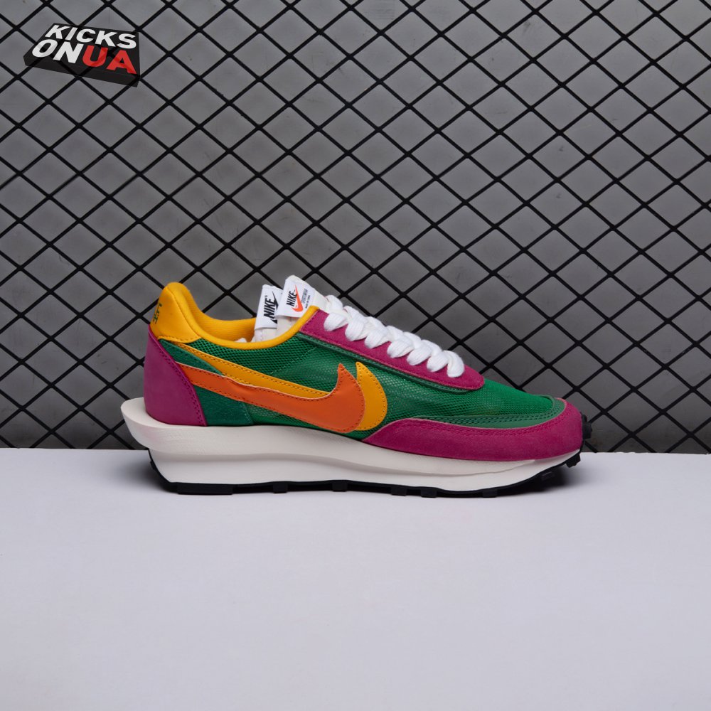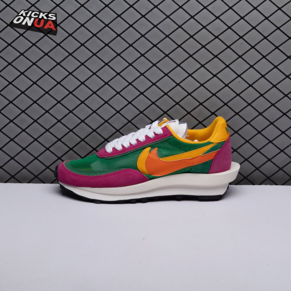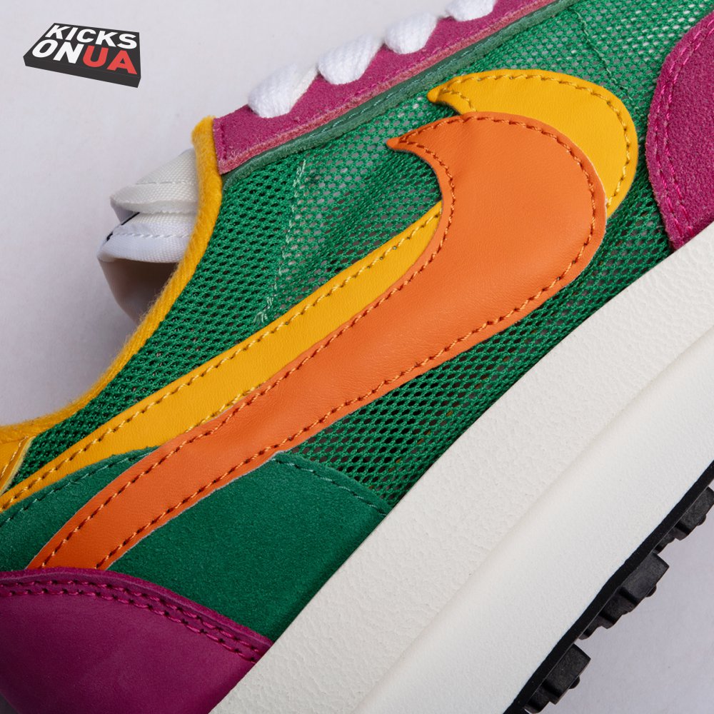 The Sacai x LDWaffle fuses the Japanese label's experimentalism with Nike's heritage ingenuity. Unveiled in September 2019, this 'Pine Green' edition updates the hybrid model in a vibrant color story. Its mesh upper sees layered suede eyestays, double reinforcements and dual, two-tone Swooshes. The aesthetic is furthered by twin tongues, optional double laces and stacked heel logos. Its double stacked, sculpted midsole follows the same formula atop a rubber waffle tread.