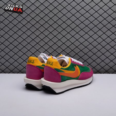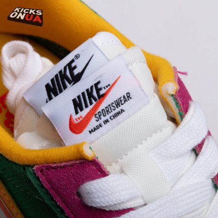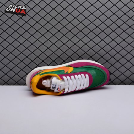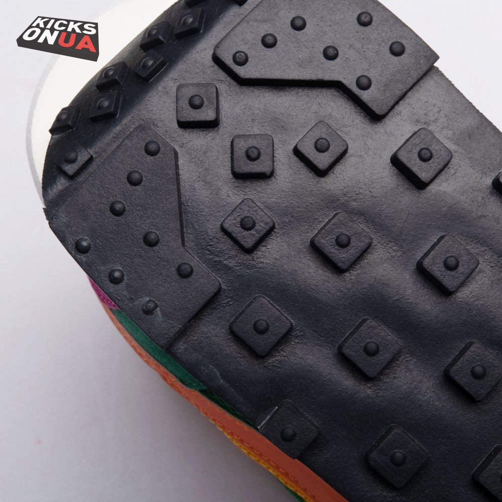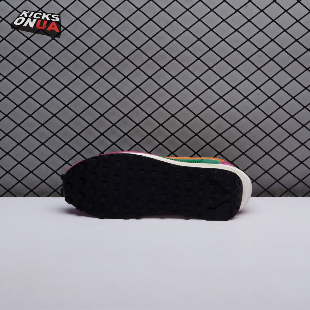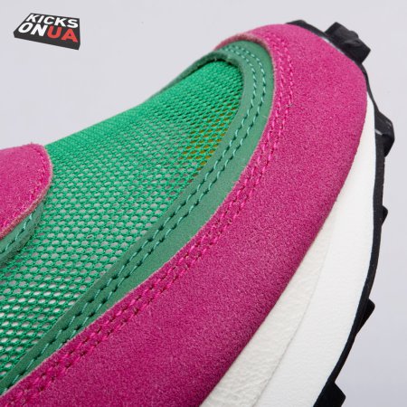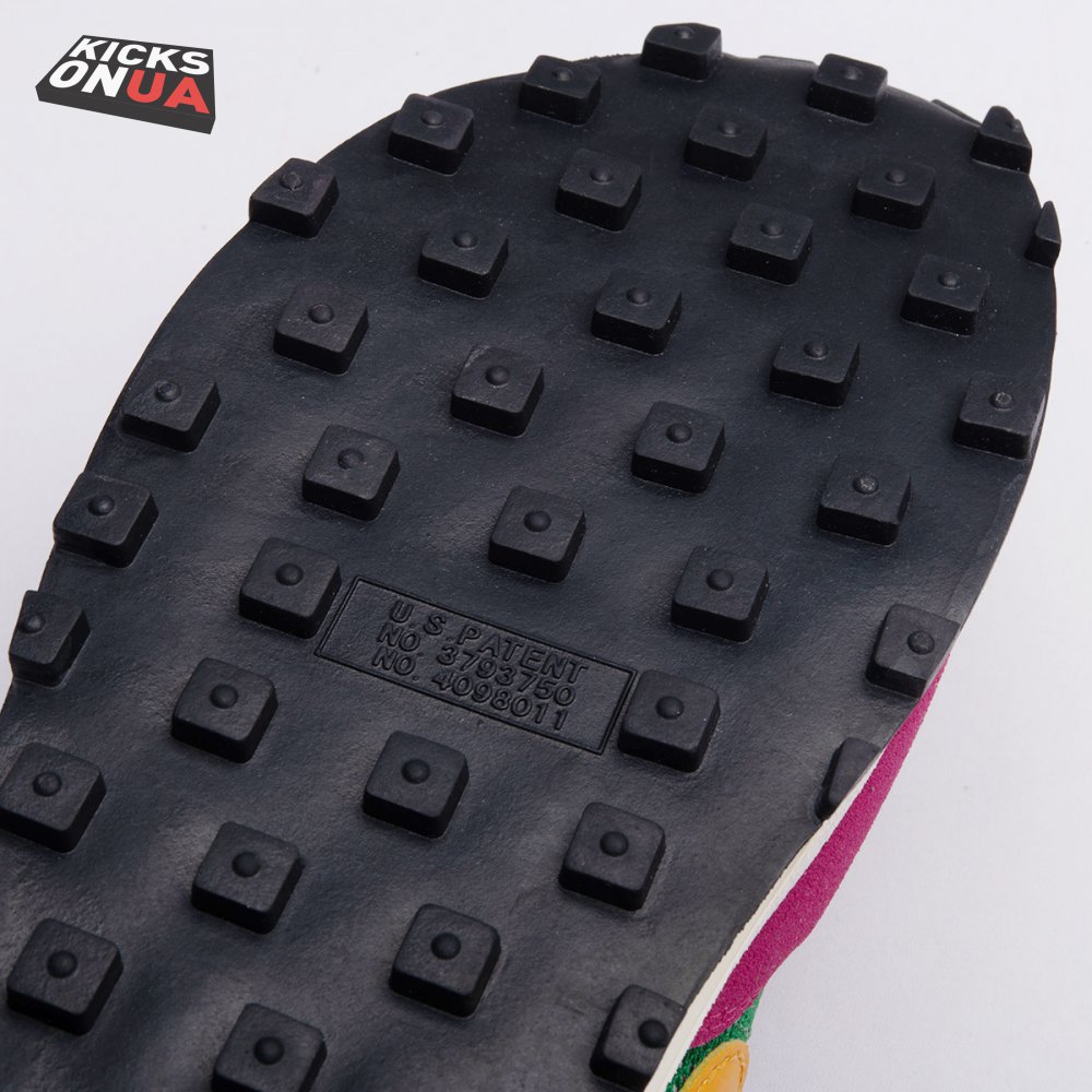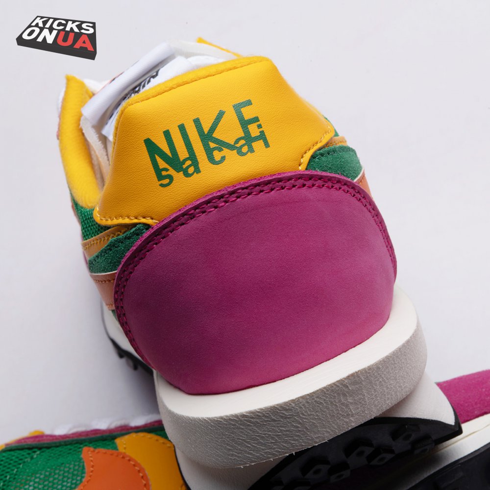 The Sacai x LDWaffle fuses the Japanese label's experimentalism with Nike's heritage ingenuity. Unveiled in September 2019, this 'Pine Green' edition updates the hybrid model in a vibrant color story. Its mesh upper sees layered suede eyestays, double reinforcements and dual, two-tone Swooshes. The aesthetic is furthered by twin tongues, optional double laces and stacked heel logos. Its double stacked, sculpted midsole follows the same formula atop a rubber waffle tread.